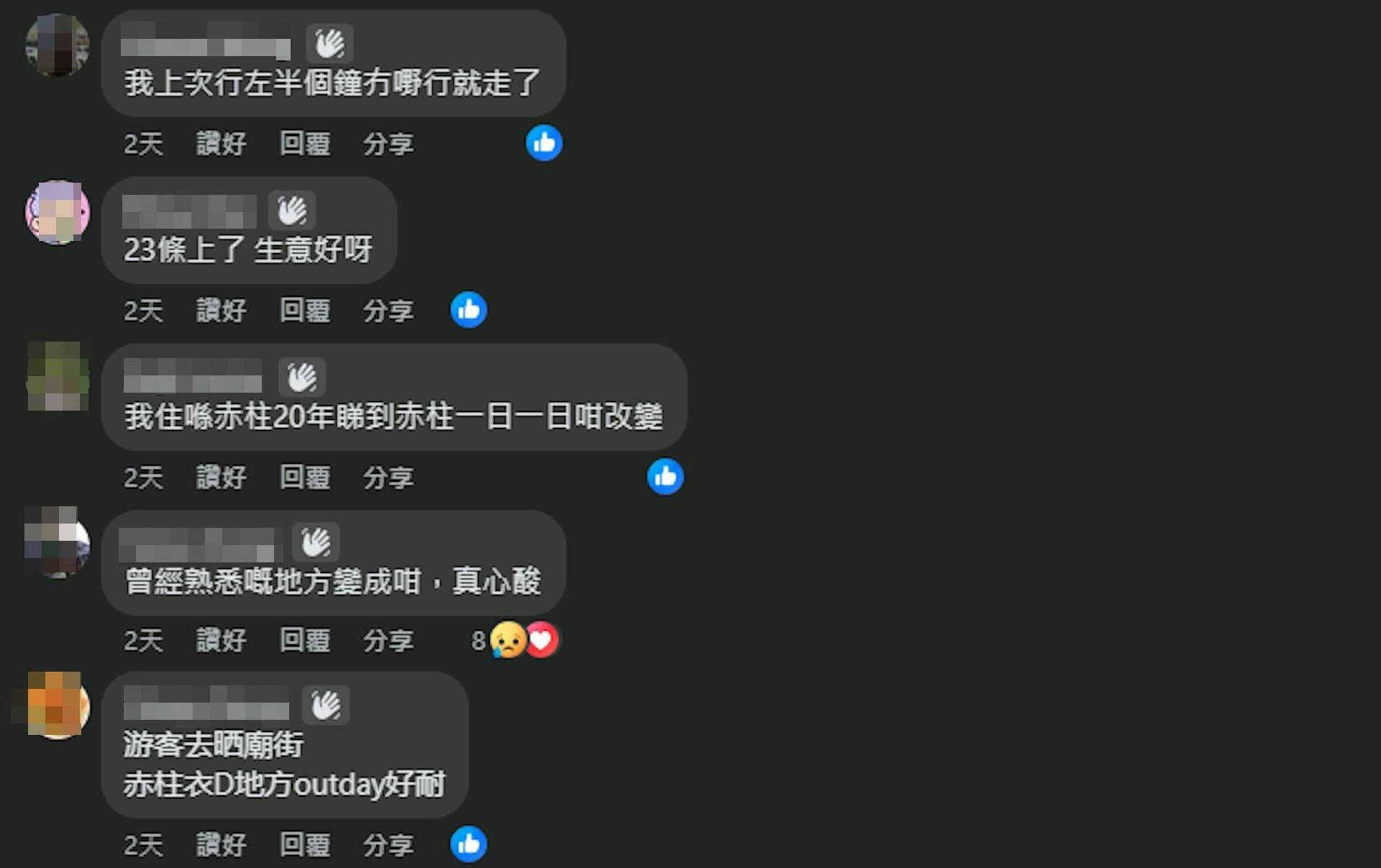赤柱街坊的網民留言指,「我住喺赤柱20年睇到赤柱一日一日咁改變」、「曾經熟悉嘅地方變成咁,真心酸」;也有網民稱「同啲檔口傾過,依家完全無鬼佬(外國人),水靜(盡)鵝飛。」