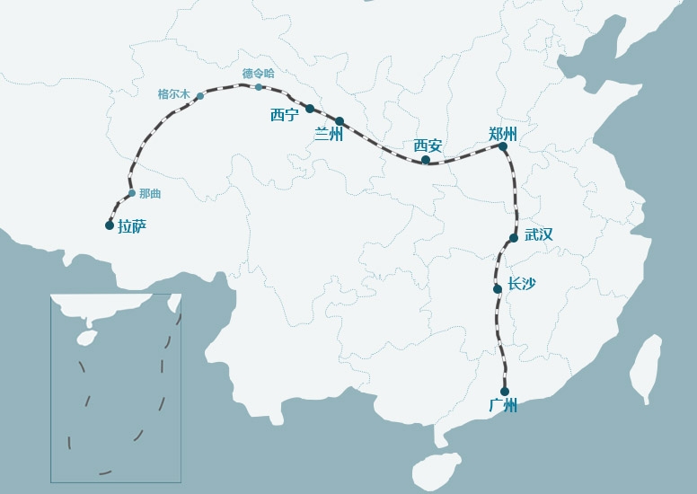 列車從南國的廣東省出發,進入到「千湖之省」湖北,接着到達中原豫劇之鄉河南後改向西行,途徑陝西和甘肅後,進入到有着「世界屋脊」之稱的青藏高原。