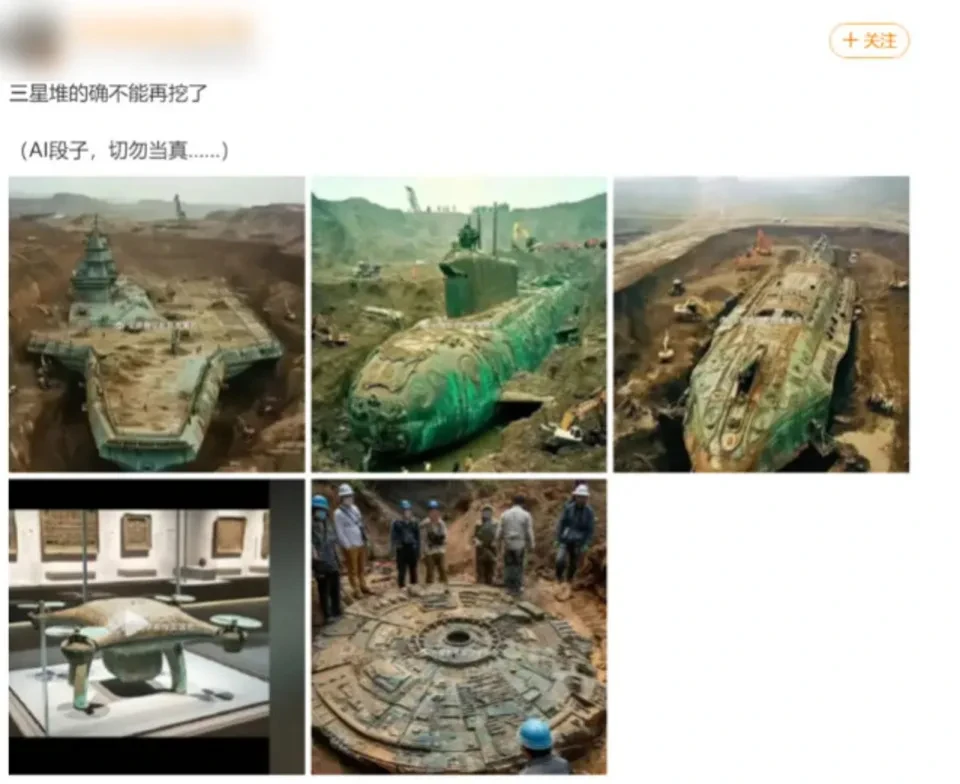 根據搜尋顯示,早在3月底,這張圖片就在社群平台流傳,其中還找到一名微博用戶轉發了這張圖片,並明確標註為「AI段子,切勿當真」,同時他還發佈了AI生成的潛艇、航母、無人機等考古梗圖。