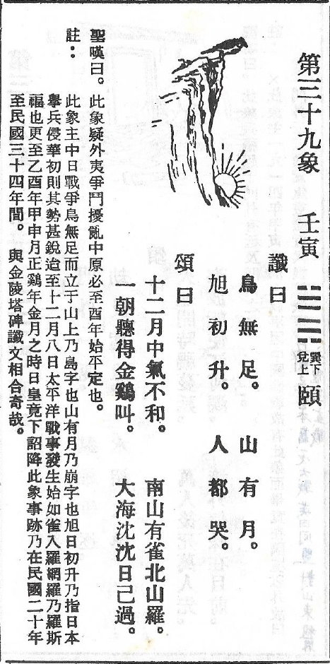 - 抗日戰爭的預言:第三十九象或相近的象被一些觀點認為是對抗日戰爭的預言。