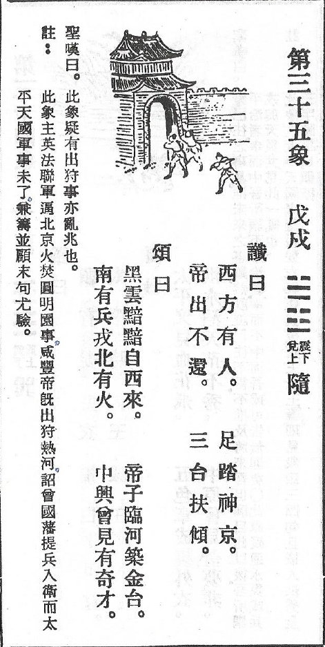 - 近代事件的預言:第三十五象或第三十七象被某些研究者認為預言了武昌起義和南北統一實現共和的情況。