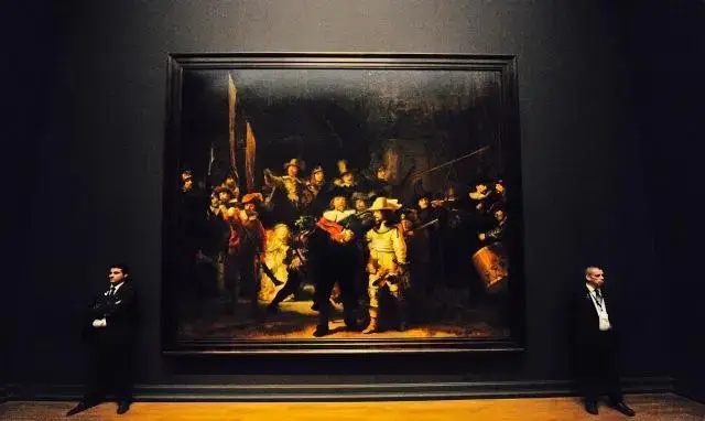 第三幅與《蒙娜麗莎》齊名的名畫是倫勃朗的《夜巡》。這幅作品描繪了一群荷蘭城市民兵在白天巡邏的場景,他們不僅是城市的守護者,也承擔著類似今天城管和聯防隊員的任務。