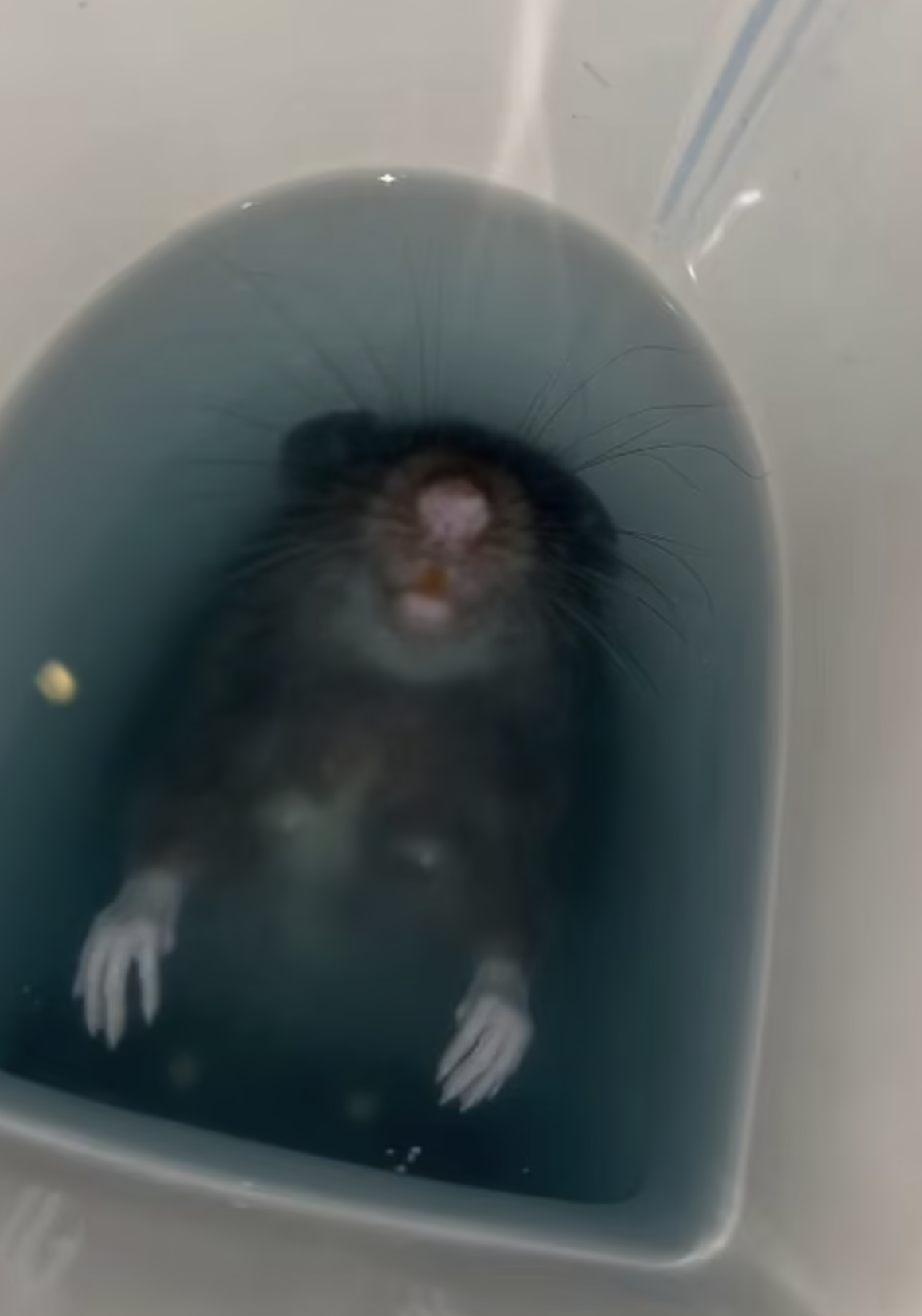 根據《每日郵報》報導,英國這只巨大的嚙齒動物卡在馬桶底部,它的長爪子和鬍鬚從水中伸出。女士在發現這只老鼠後,尖叫聲連連,因為這只老鼠——後來在水中倒立溺亡——爬上了她的排水管,藏在馬桶底部。