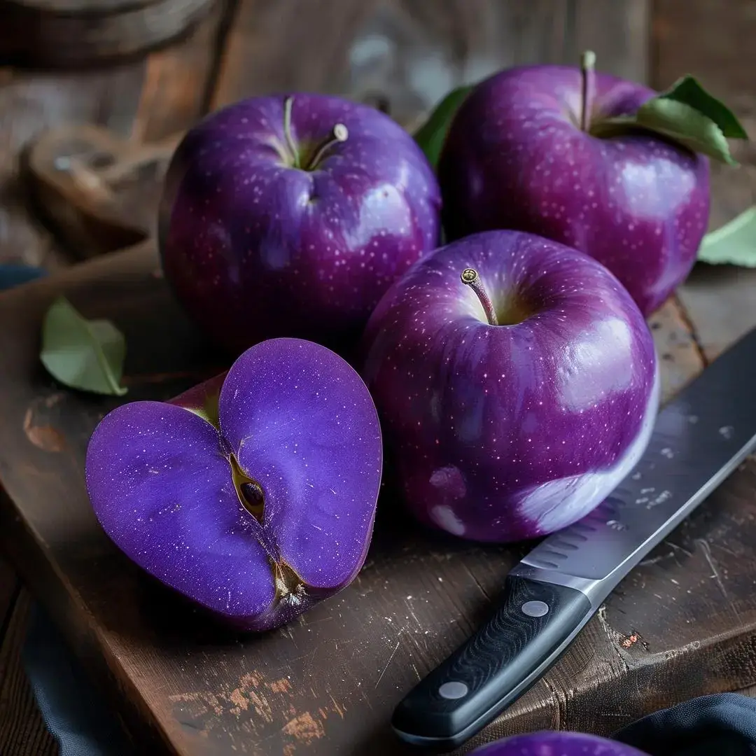 原照片由Instagram用戶Unnaturalist AI上傳,展示了幾個紫色的蘋果在切菜板上閃閃發光,其中一個還被切成兩半,露出了它那紫羅蘭色的內部。