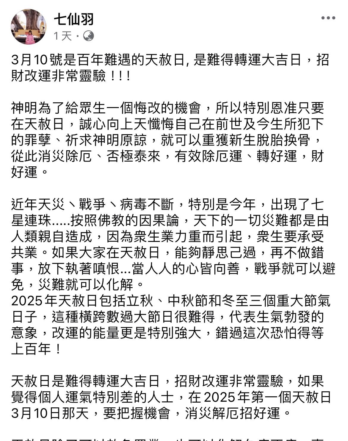 七仙羽(七師傅)經常在其Facebook上發文教大家開運,前日(3月8日)她便向大家介紹3月10日轉運大吉日「天赦日」,她表示這個日子是百年難得一遇的大吉日,是神明給予眾生一個悔改的機會、特別在天赦日給眾生一個懺悔的機會,可以消除災害。七師傅教大家開運5法,亦講解當日的3大禁忌,想把握這個轉運的好日子就要看看。