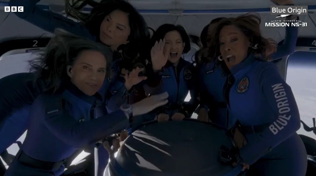 這次飛行持續約11分鐘,6名女性跨越國際公認的太空邊界,在距離地球100多公里的高度上體驗失重狀態。在飛行期間,Katy Perry唱起Louis Armstrong的《What a Wonderful World》。
