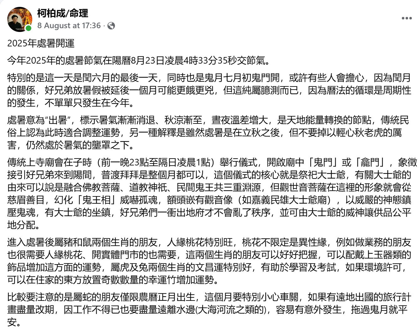 🔴 2025年處暑節氣落在陽曆8月23日凌晨4時33分35秒,是閏六月的最後一天,也正是農曆七月初一鬼門開的日子。