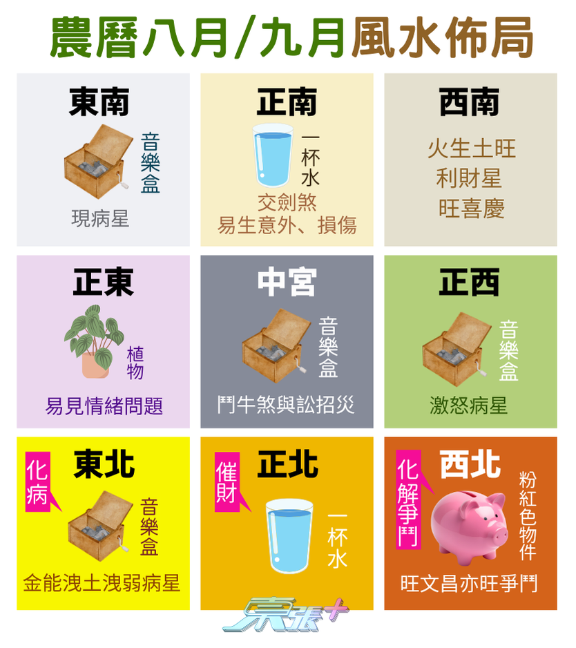 中宮|本年中宮為二黑病符,本月中宮為三碧爭門|兩凶星相遇為鬥牛煞與訟招災,宜放音樂盒洩土制木。