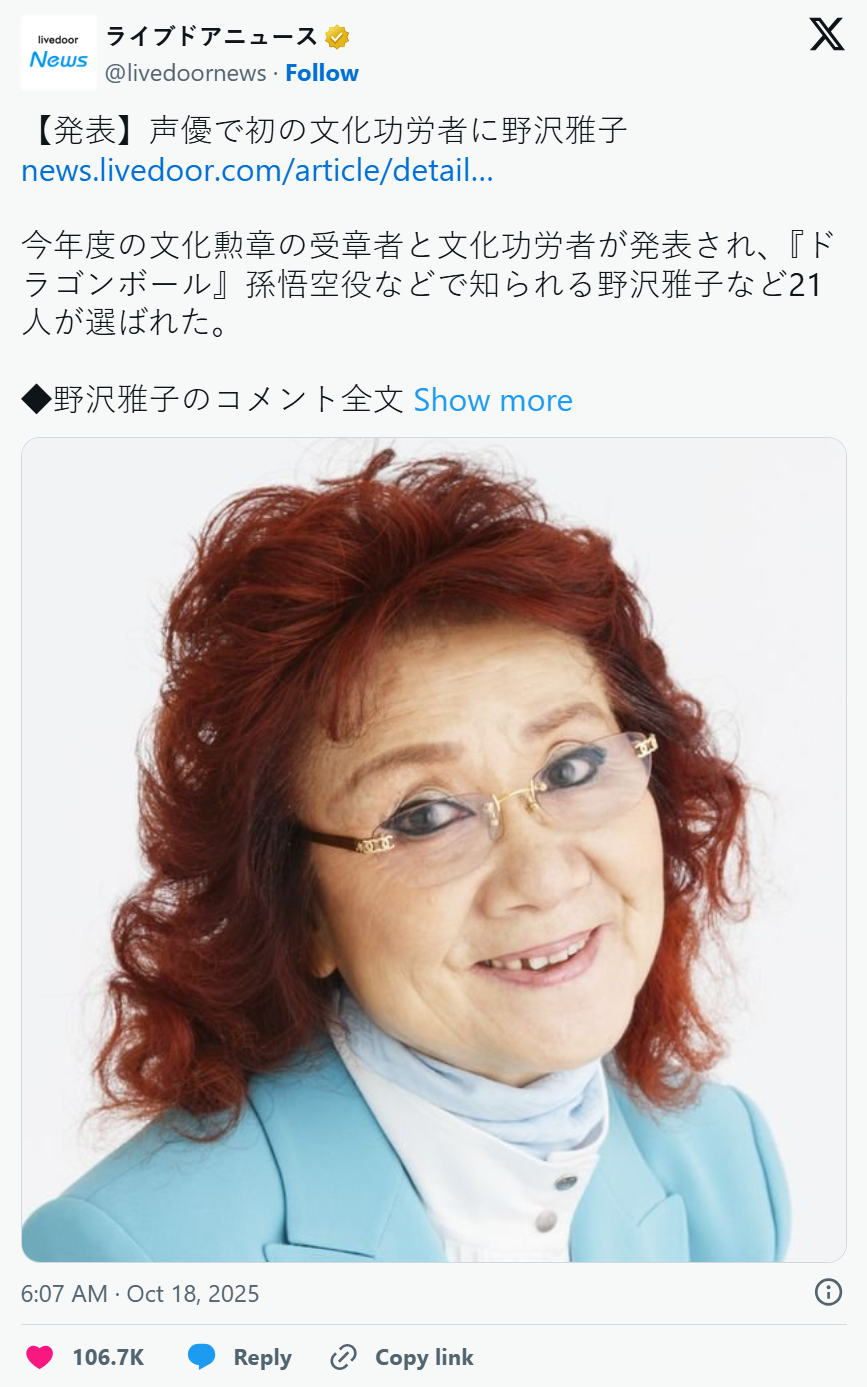 🟢 2025年,日本公布了「文化勳章」及「文化功勞者」名單,野澤雅子成為史上第一位獲此殊榮的聲優。過去,其他獲頒此榮的文化名人包括動畫大師宮崎駿、Nintendo的宮本茂,以及勇者鬥惡龍系列的音樂作曲家椙山浩一等。
