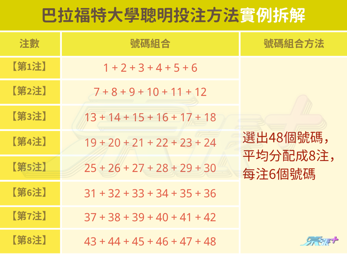 - 選出1-48號,平均分成8注,每注6個號碼(共48號)。