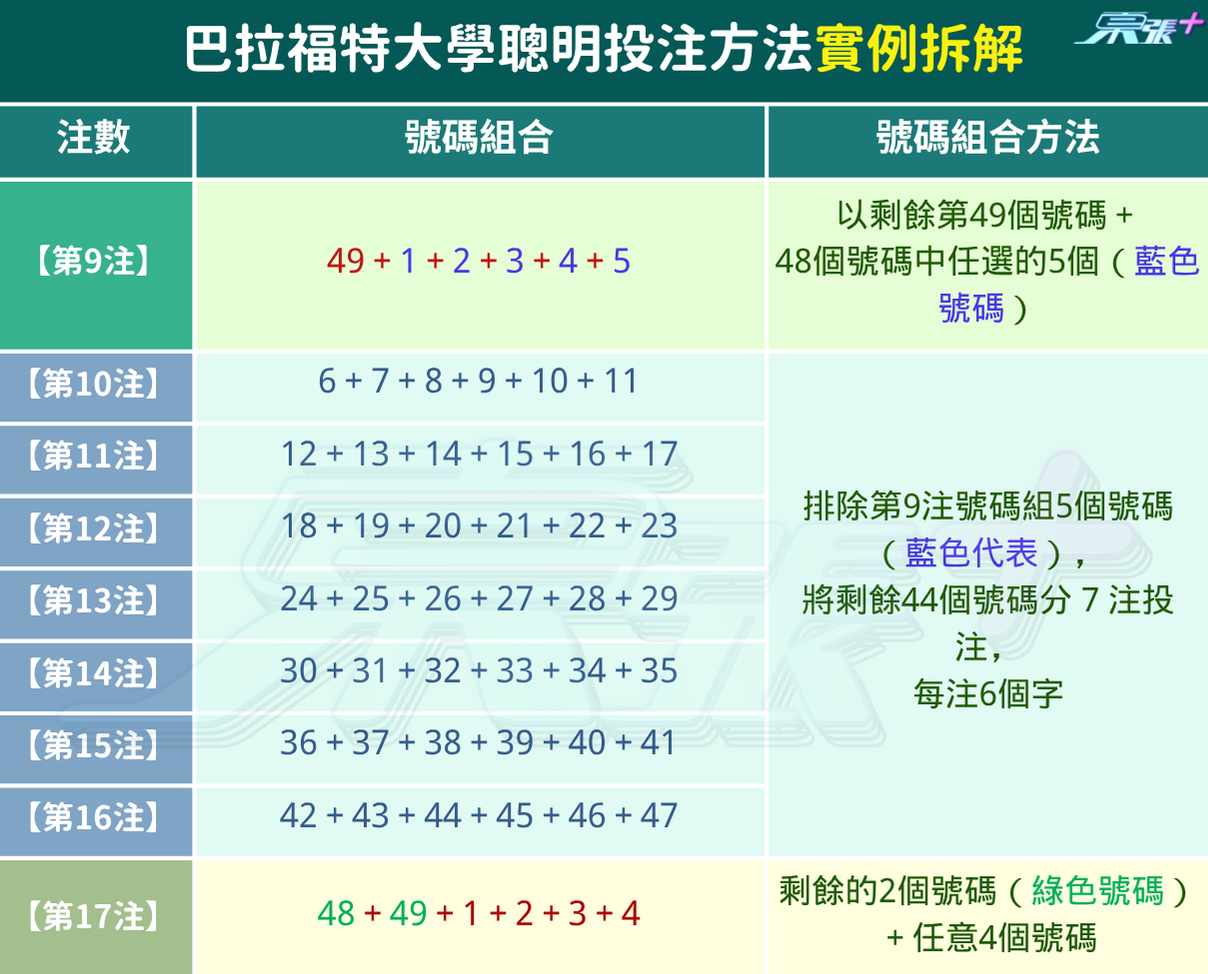 - 用17注單式投注,每注6個號碼,僅需170元即可覆蓋所有號碼,極大減少成本,有效提升中獎率。