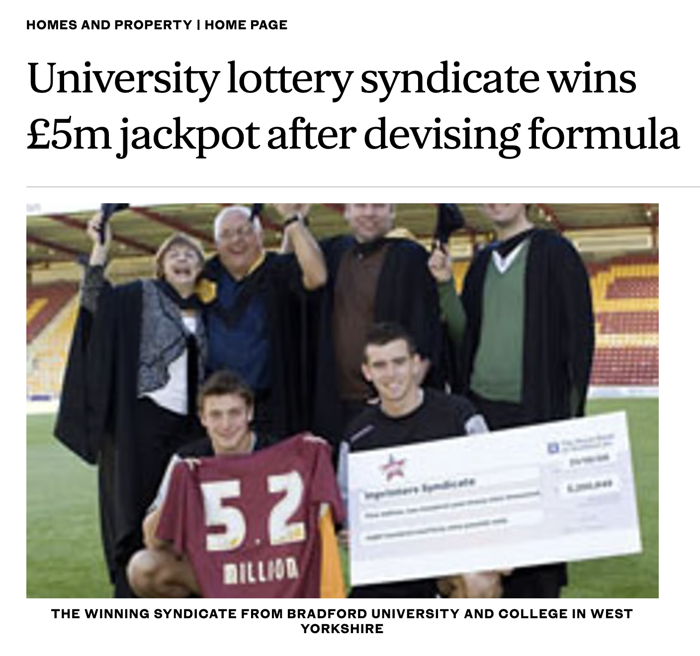 - 2006年英國巴拉福特大學(University of Bradford)17名教職員,成功設計低成本組合,贏得National Lottery 530萬英鎊頭獎,方法源於數學分組原則。