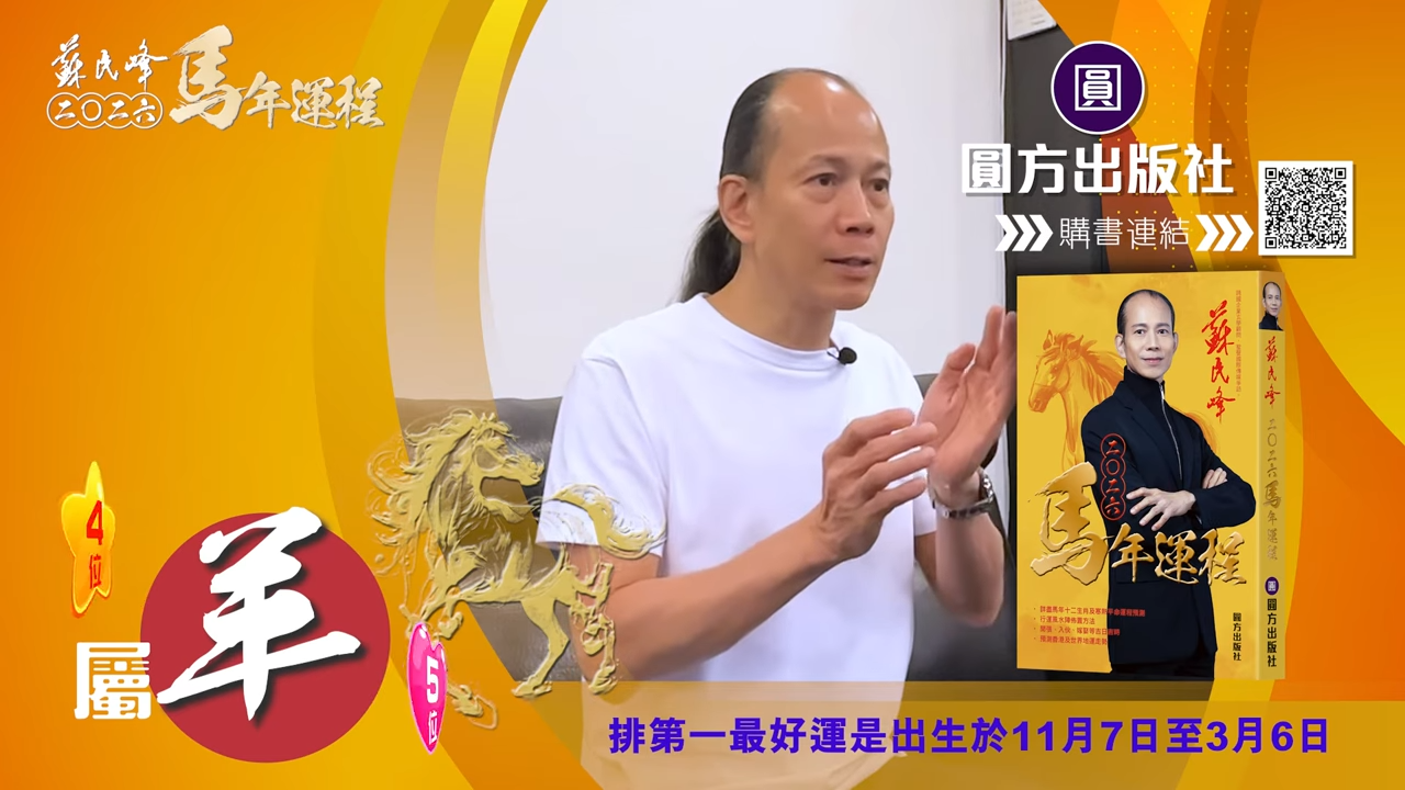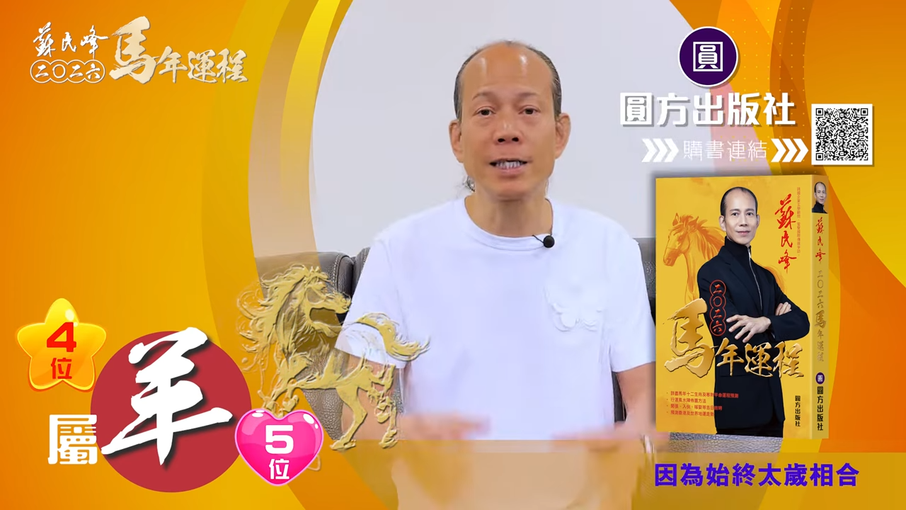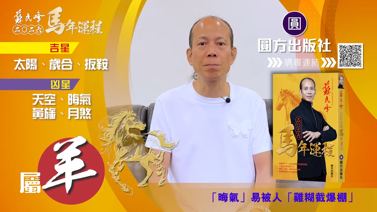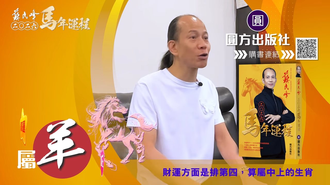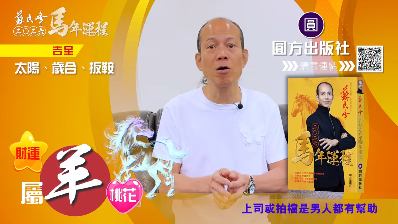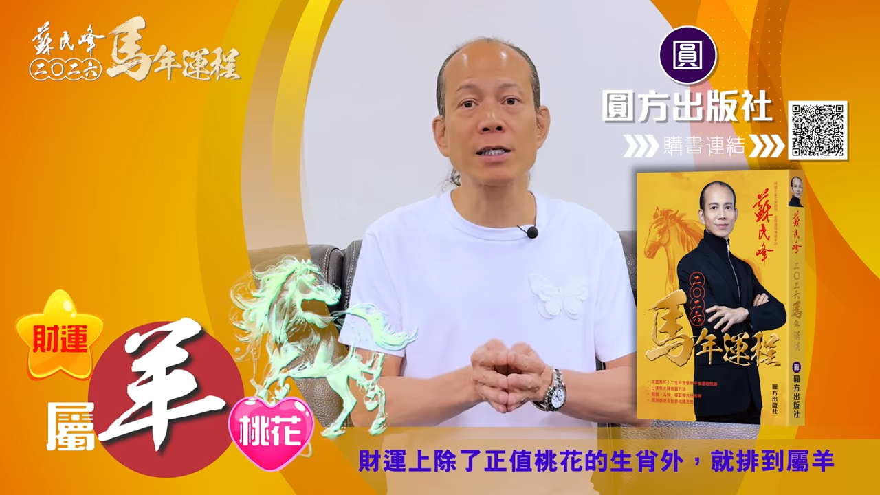 【蘇民峰/蘇民峰師傅/蘇民峰2026運程/馬年運程預測/丙午年生肖運程】踏入年尾,蘇民峰師傅全新《2026馬年生肖運程》正式推出,他於YouTube頻道「娛樂星玄」上深入分析十二生肖運勢。屬羊人士因為與馬年太歲相合,整體發展平穩向好。蘇師傅指出,屬羊人士與太歲太歲遙合,人緣及財運俱佳,而桃花運則屬中規中矩,不過明年有凶星「晦氣」,做事很容易功虧一簣。