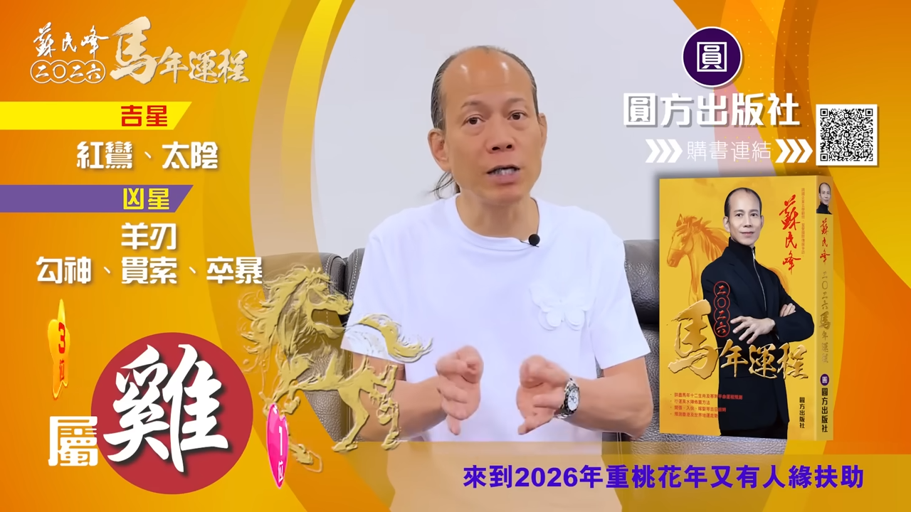 【蘇民峰/蘇民峰師傅/蘇民峰2026運程/馬年生肖運程預測/丙午年運程】踏入年尾,著名玄學大師蘇民峰師傅推出全新《2026馬年十二生肖運程》,並於YouTube頻道「娛樂星玄」詳盡分析各生肖運勢。屬雞人士馬年運勢大旺,「紅鸞星動」有利感情緣分,單身者有望脫單或結婚添丁。雖有凶星「羊刃」出現,但受吉星化解,整體運勢平穩上揚。