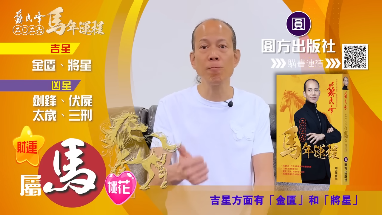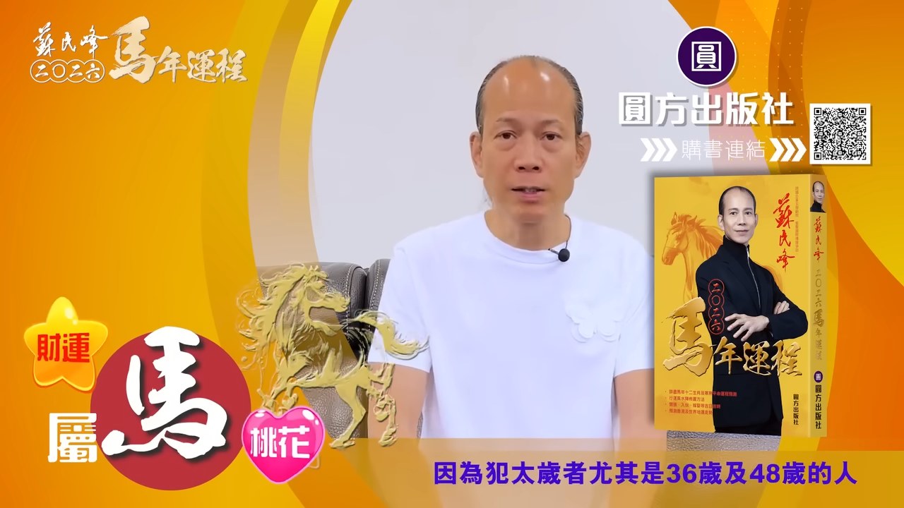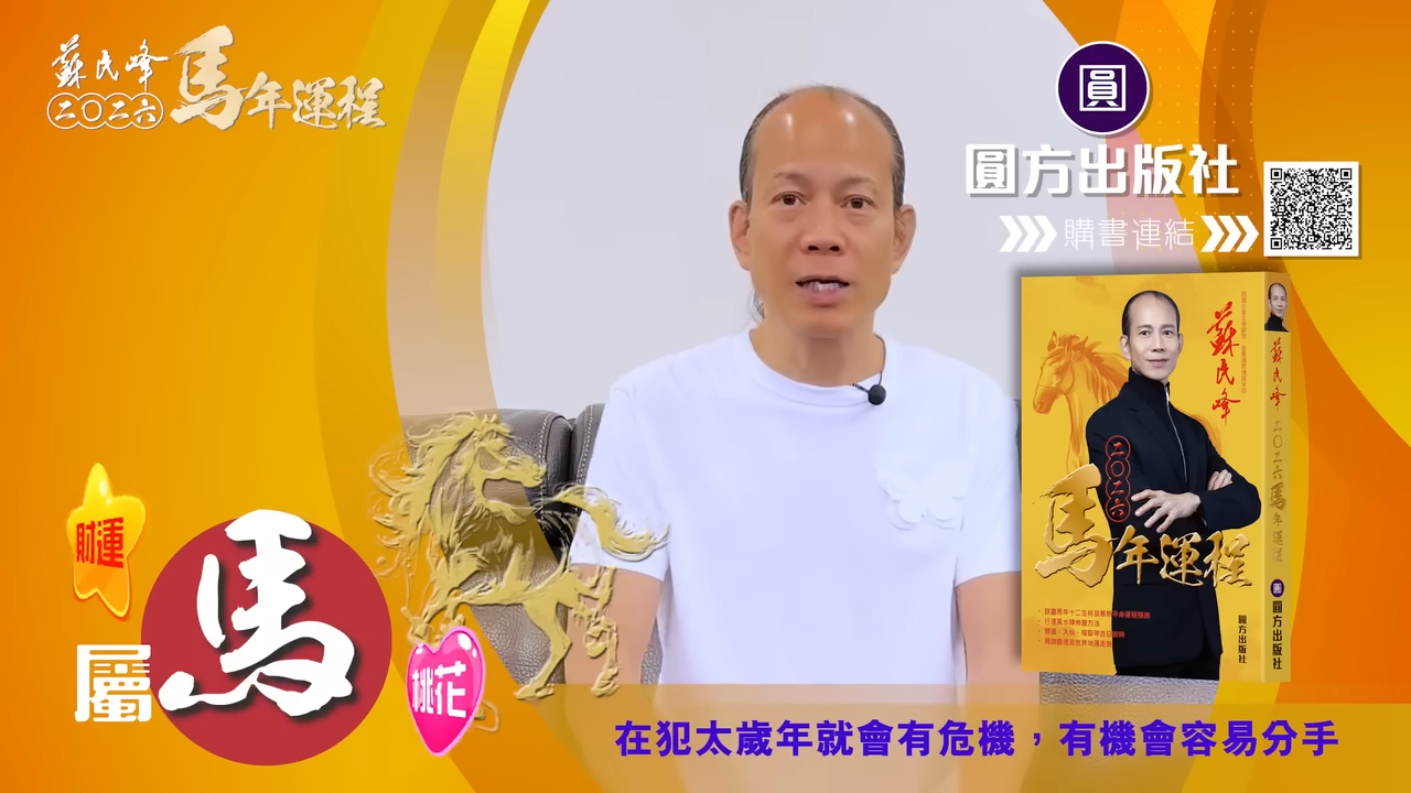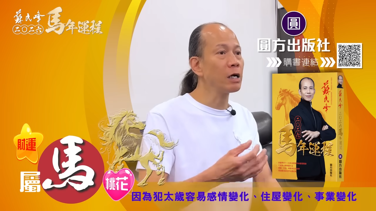 【蘇民峰/蘇民峰師傅/蘇民峰2026運程/馬年生肖運程預測/丙午年運程】踏入年尾,著名玄學大師蘇民峰師傅推出全新《2026馬年十二生肖運程》,並於YouTube頻道「娛樂星玄」詳盡分析各生肖運勢。屬馬人士於丙午馬年犯太歲,財運及桃花均在十二生肖中排十二,不過師傅指並不如想像中差,反而要留健康、有受傷見血的風險,蘇師傅亦有教化解方法。