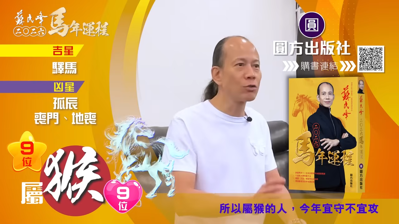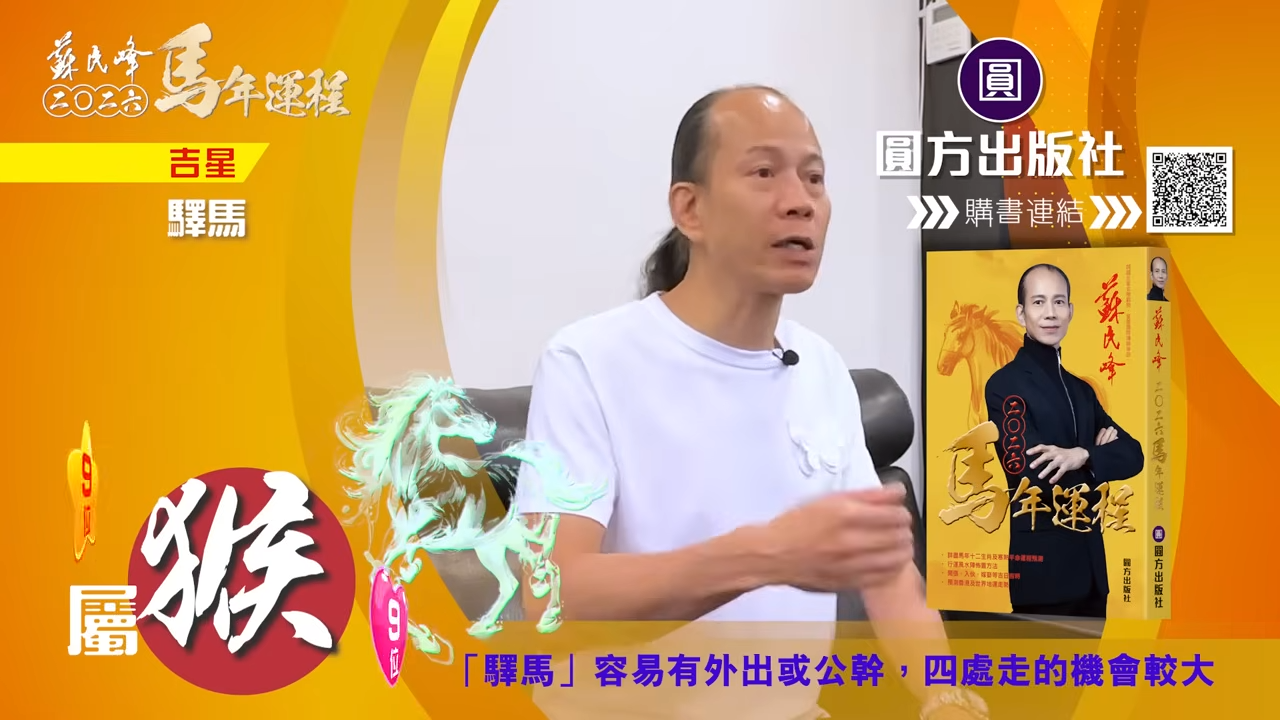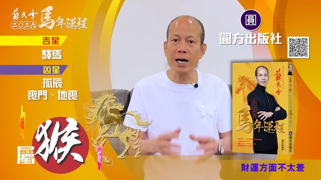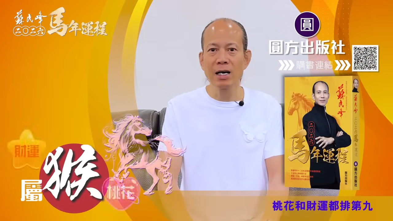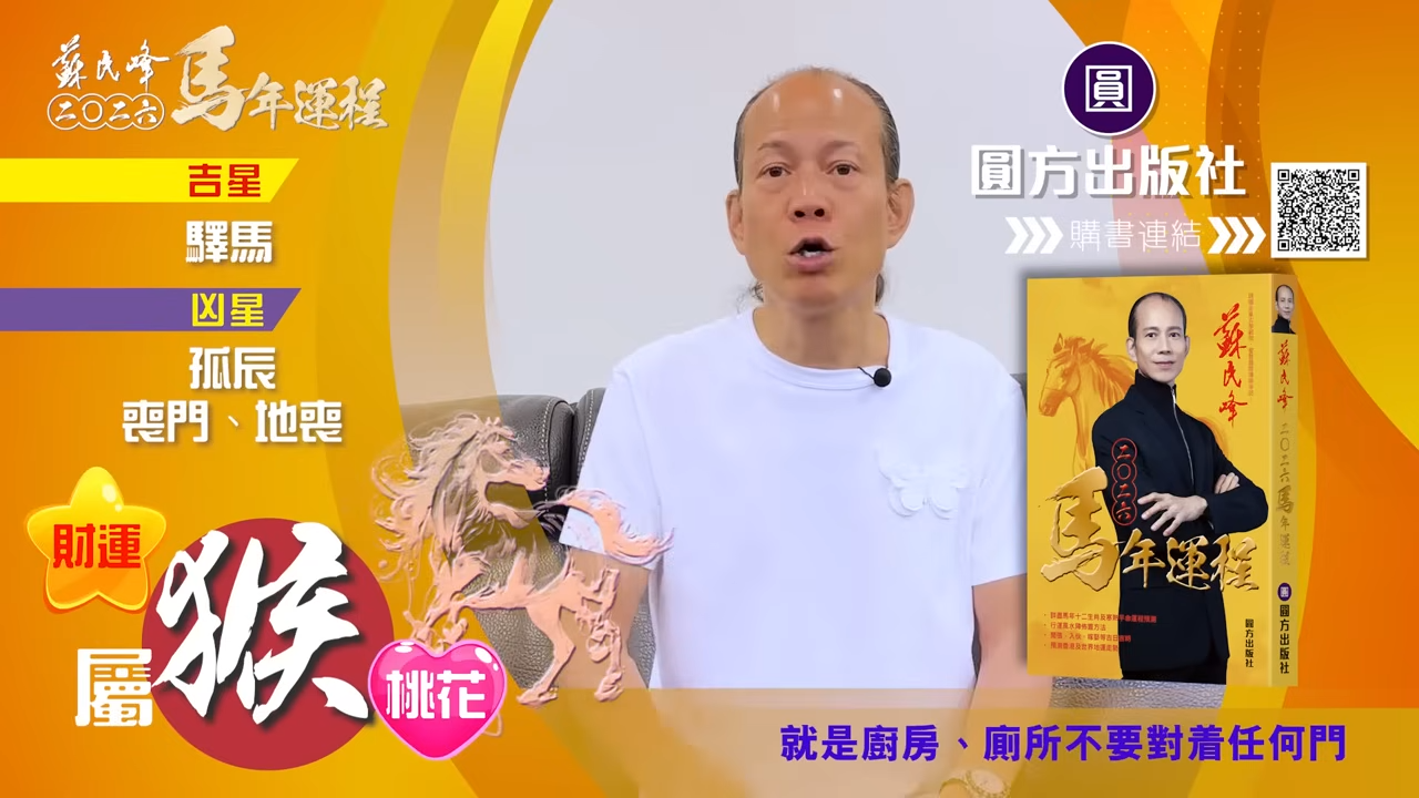 【蘇民峰/蘇民峰師傅/蘇民峰2026運程/馬年生肖運程預測/丙午年運程】踏入年尾,著名玄學大師蘇民峰師傅推出全新《2026馬年十二生肖運程》,並於YouTube頻道「娛樂星玄」詳盡分析各生肖運勢。2026馬年屬猴迎來「驛馬年」,運勢變動大。蘇民峰師傅指屬猴宜守不宜攻,適合旅行或搬屋助旺運。財運中等,冬生可積極轉變,夏生宜穩定為主。蘇師傅亦分享九運下風水屋揀選重點,提醒避開廚廁對門布局。蘇師傅亦分享揀風水屋重點,教你在九運下挑選風水好屋。