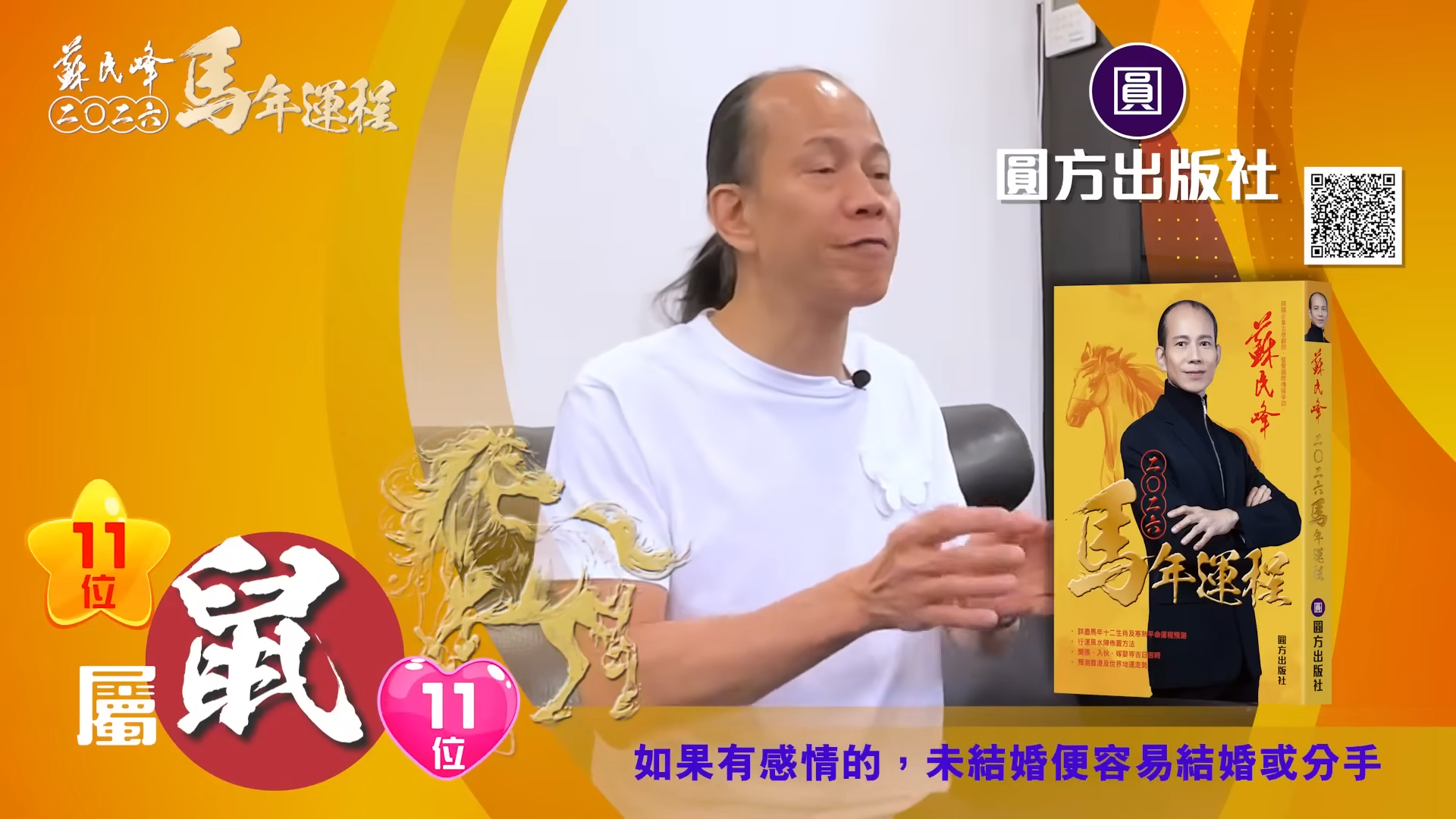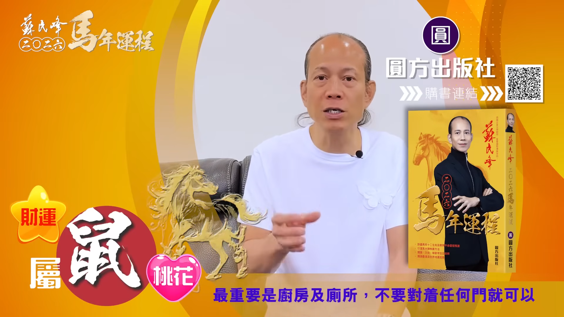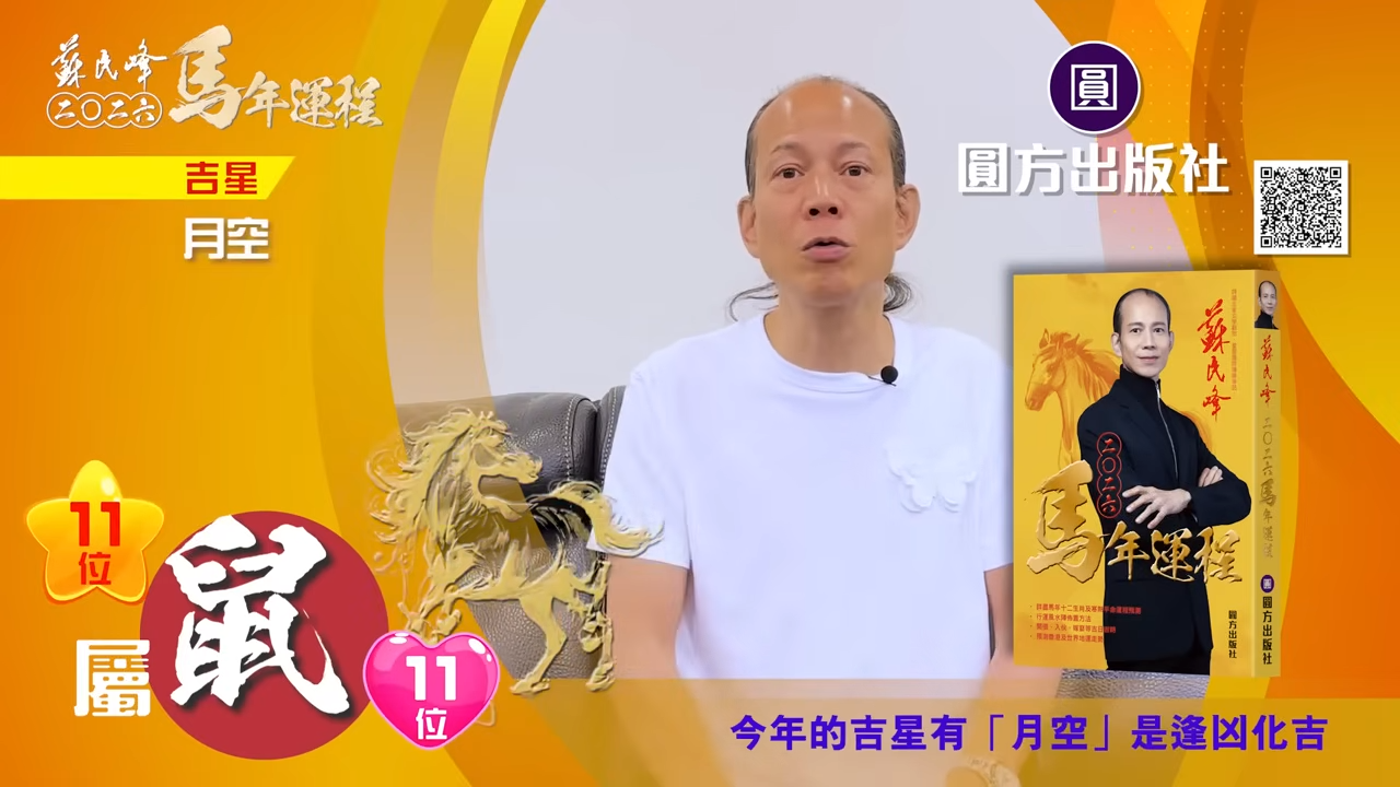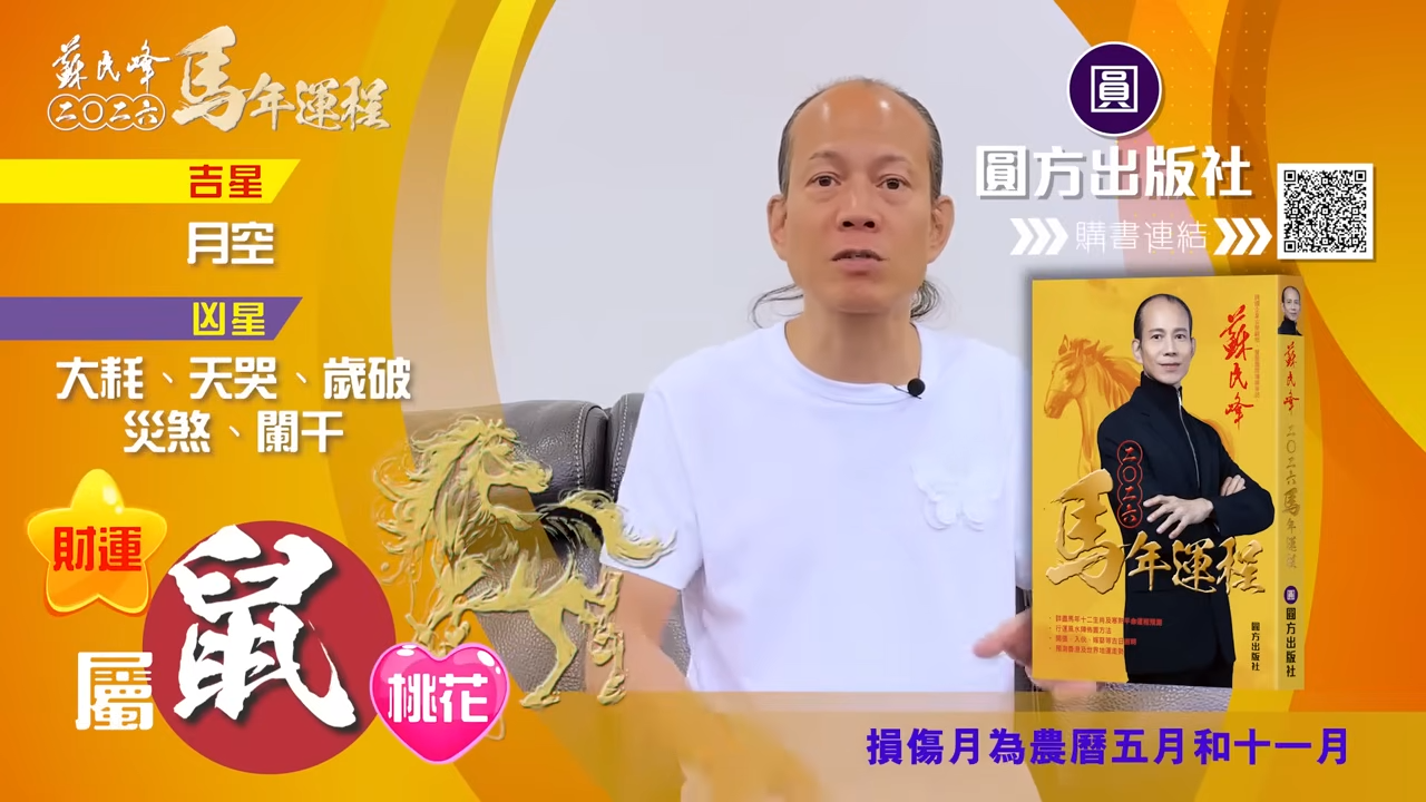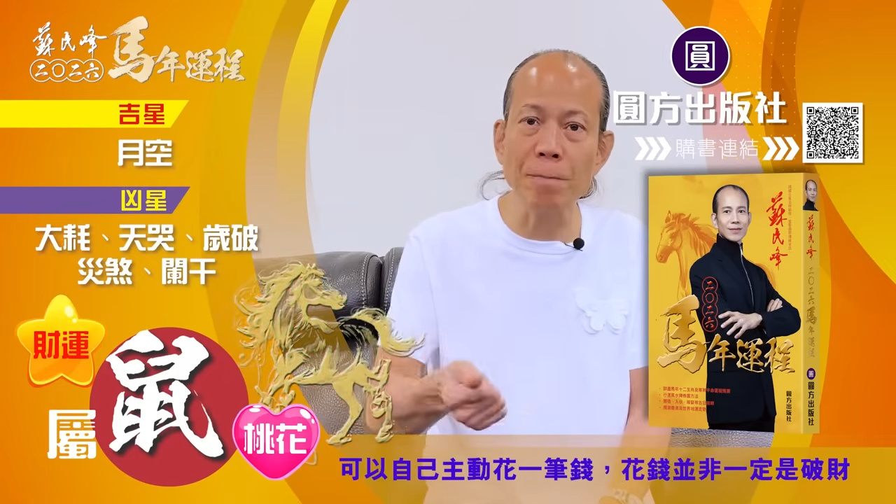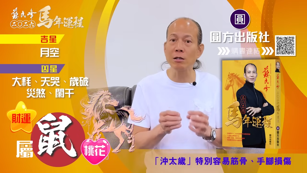 【蘇民峰/蘇民峰師傅/蘇民峰2026運程/馬年生肖運程預測/丙午年運程】踏入年尾,著名玄學大師蘇民峰師傅推出全新《2026馬年十二生肖運程》,並於YouTube頻道「娛樂星玄」詳盡分析各生肖運勢。2026馬年屬鼠人士「沖太歲」,感情特別容易生變,因為「沖太歲」的「子午相沖」,馬年更受傷機會。另外亦有置業搬屋的可能,蘇師傅亦分享幾招為家居催財旺健康的方法,他亦分享揀風水屋重點,教你在九運下挑選風水好屋。