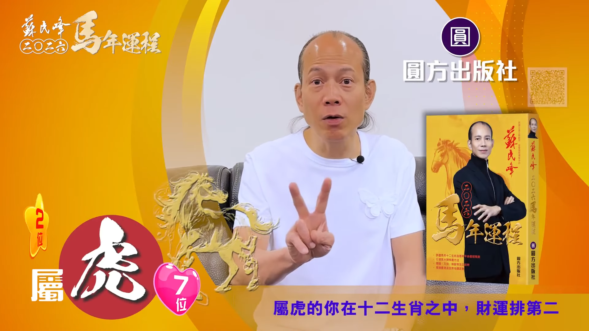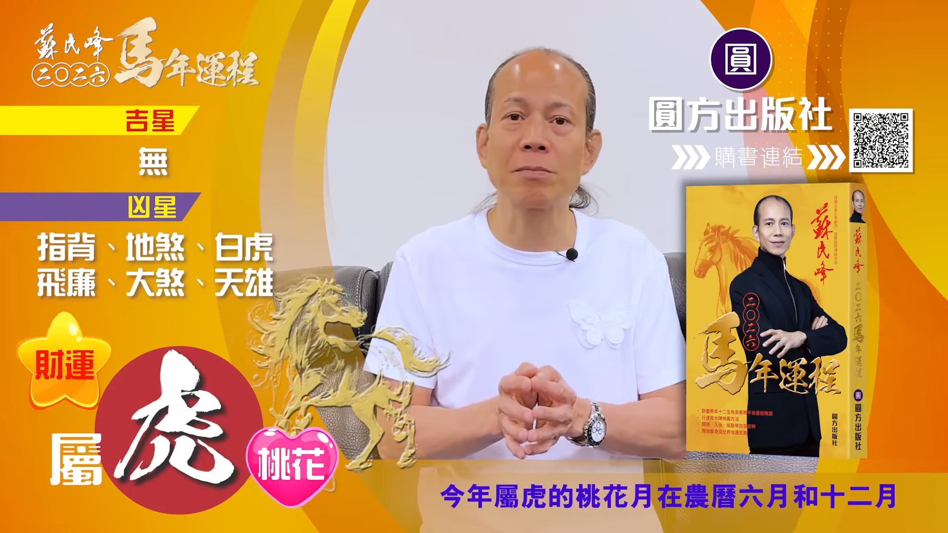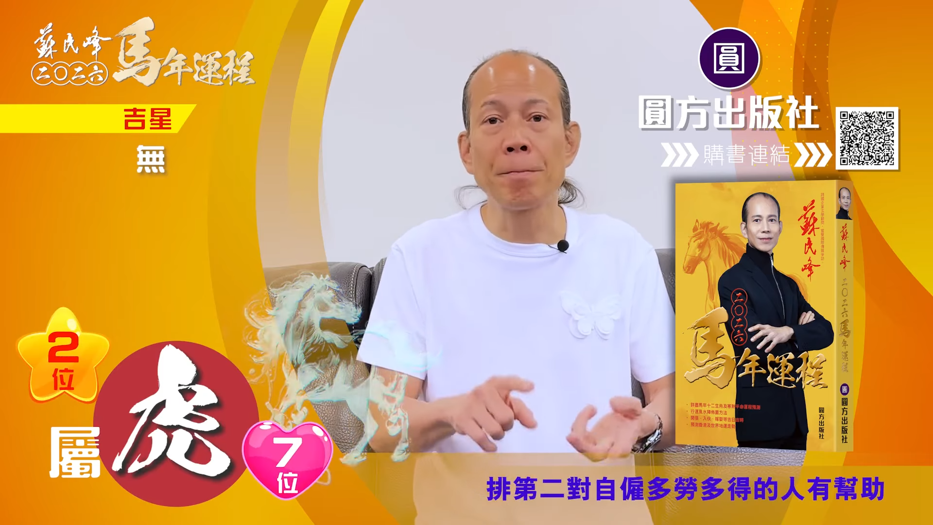 【蘇民峰/蘇民峰師傅/蘇民峰2026運程/馬年生肖運程預測/丙午年運程】踏入年尾,著名玄學大師蘇民峰師傅推出全新《2026馬年十二生肖運程》,並於YouTube頻道「娛樂星玄」詳盡分析各生肖運勢。屬虎人士於丙午馬年財運排第二,但對上班族卻沒有甚麼幫助。來到馬年,屬虎人士與「太歲相合」,感情運整體穩定,不過單身人士未必有運氣脫單,來年亦要小心自己言行,因為凶星主有人篤背脊,即睇蘇民峰師傅的馬年運程貼士。