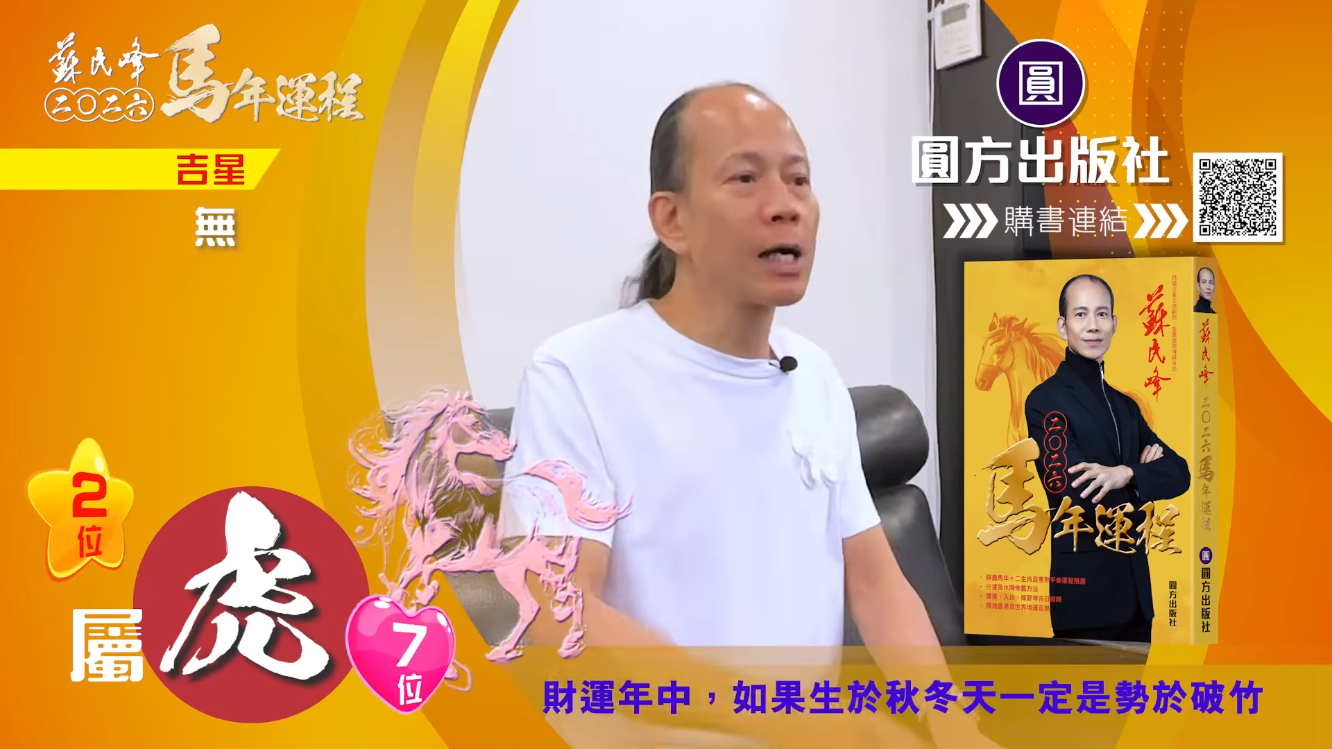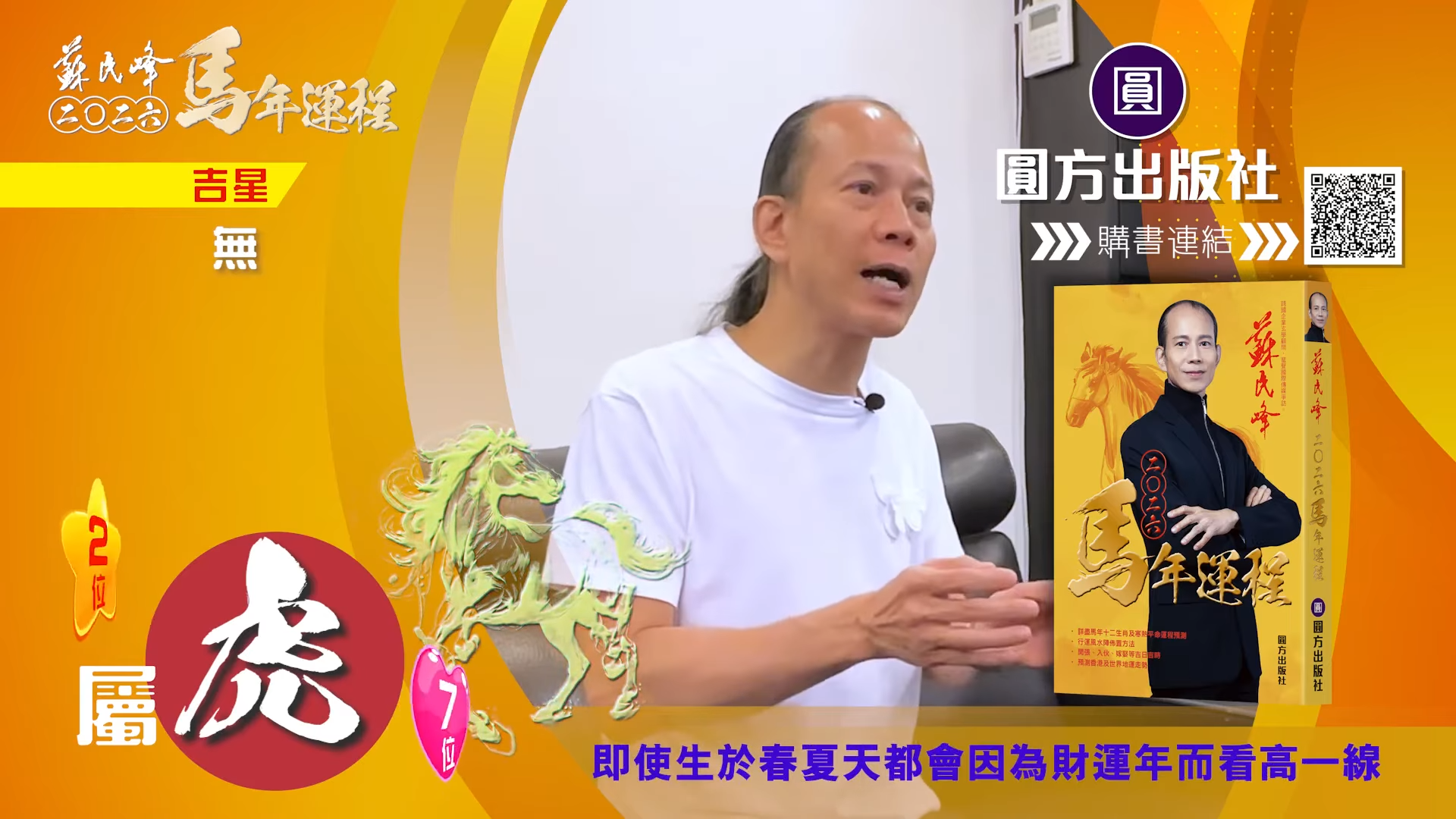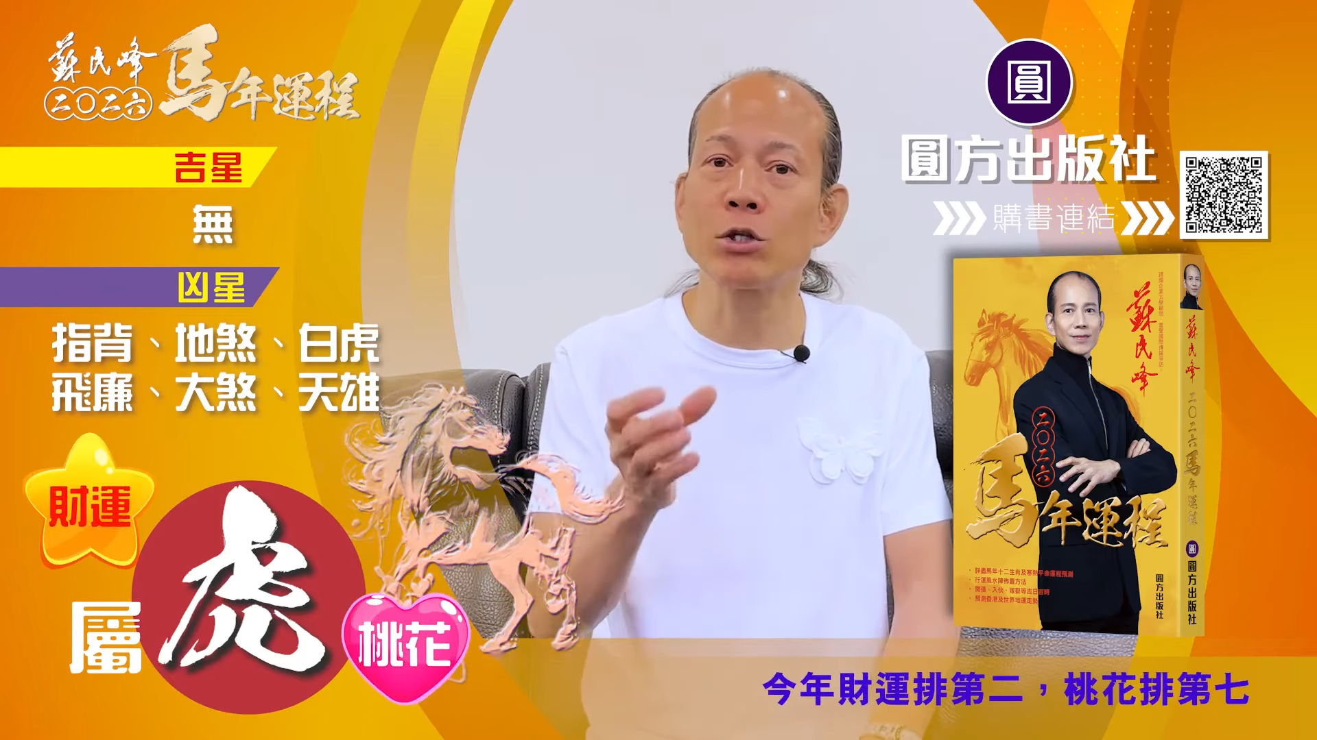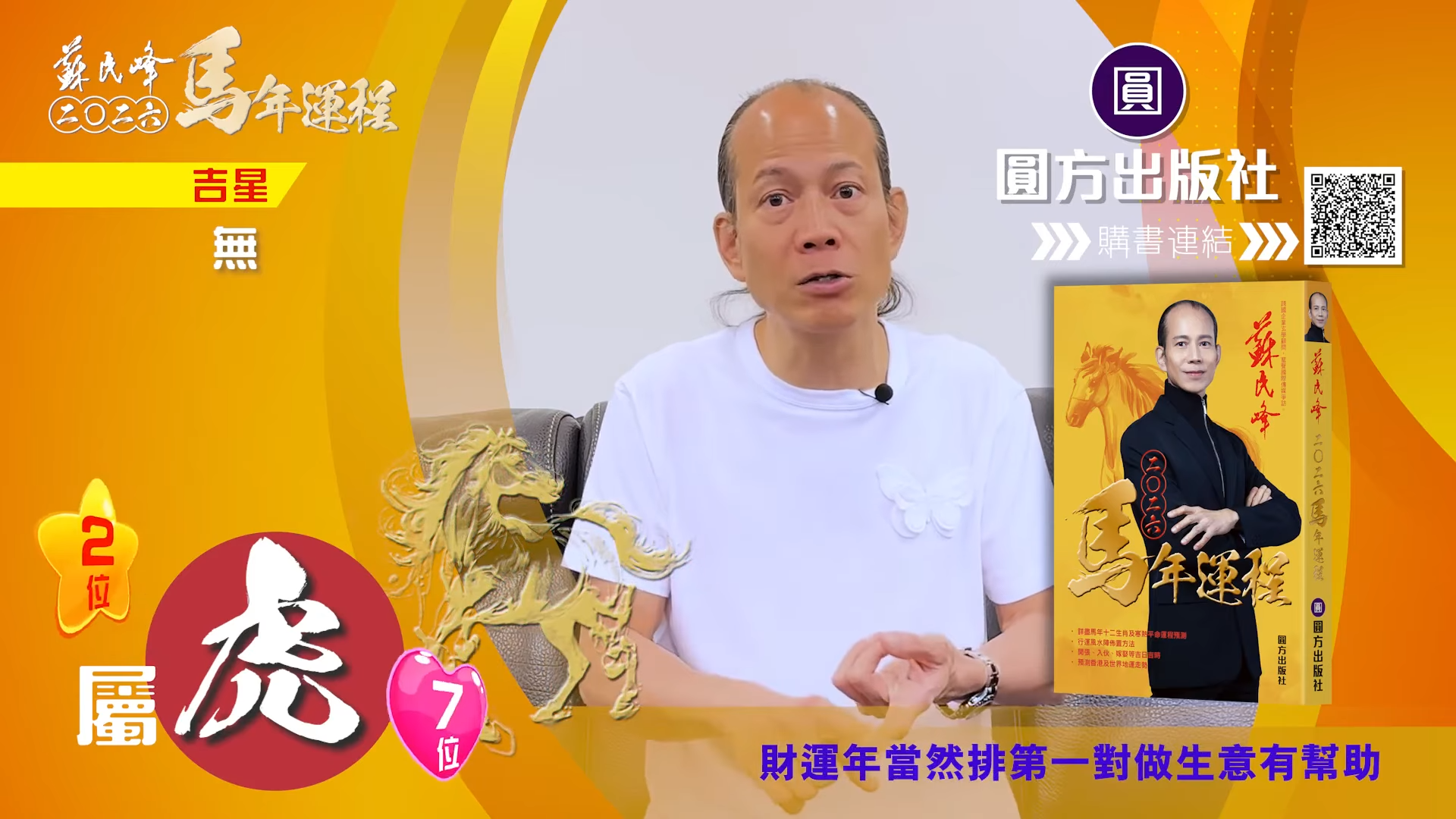 【蘇民峰/蘇民峰師傅/蘇民峰2026運程/馬年生肖運程預測/丙午年運程】踏入年尾,著名玄學大師蘇民峰師傅推出全新《2026馬年十二生肖運程》,並於YouTube頻道「娛樂星玄」詳盡分析各生肖運勢。屬虎人士於丙午馬年財運排第二,但對上班族卻沒有甚麼幫助。來到馬年,屬虎人士與「太歲相合」,感情運整體穩定,不過單身人士未必有運氣脫單,來年亦要小心自己言行,因為凶星主有人篤背脊,即睇蘇民峰師傅的馬年運程貼士。