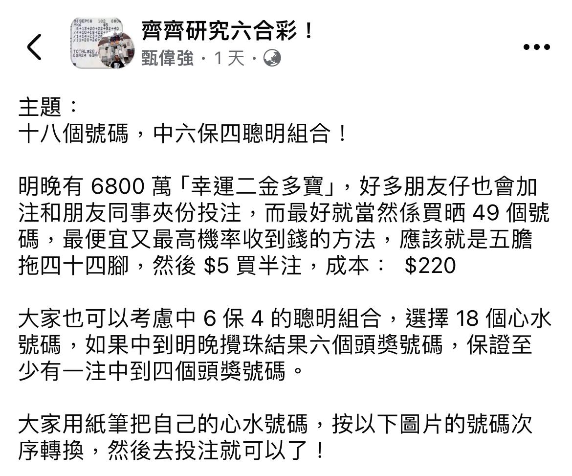 六合彩連續八期無人中頭獎!11月29日(六)金多寶累積7,100萬,預計獨中頭獎可高達8,800萬!「齊齊研究六合彩」版主強哥最新分享超低成本「中六保四」玩法:只需$210(42注半注),18個心水號碼包攪出全部6個正碼,數學100%保證最少1注中五獎($640全注/$320半注),回報率達1.5倍以上!
