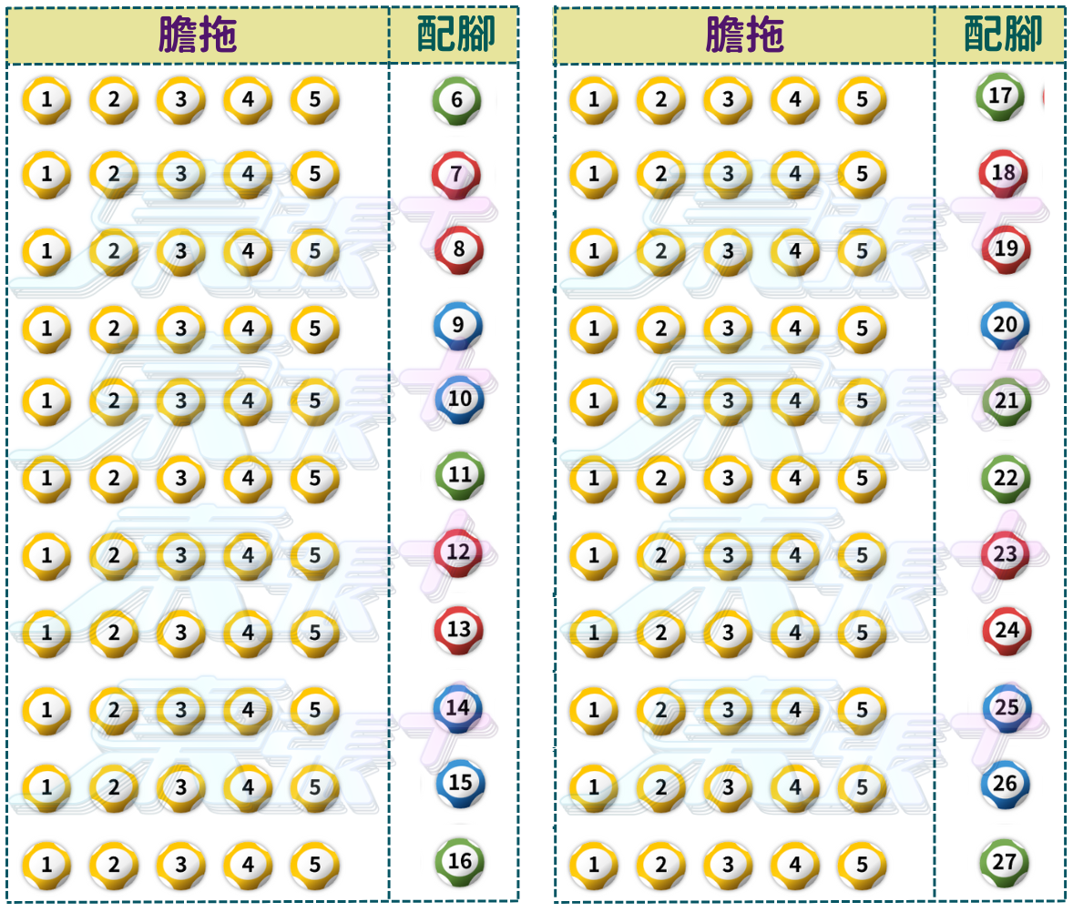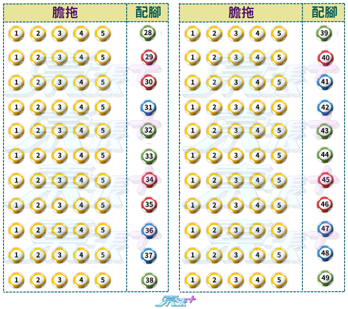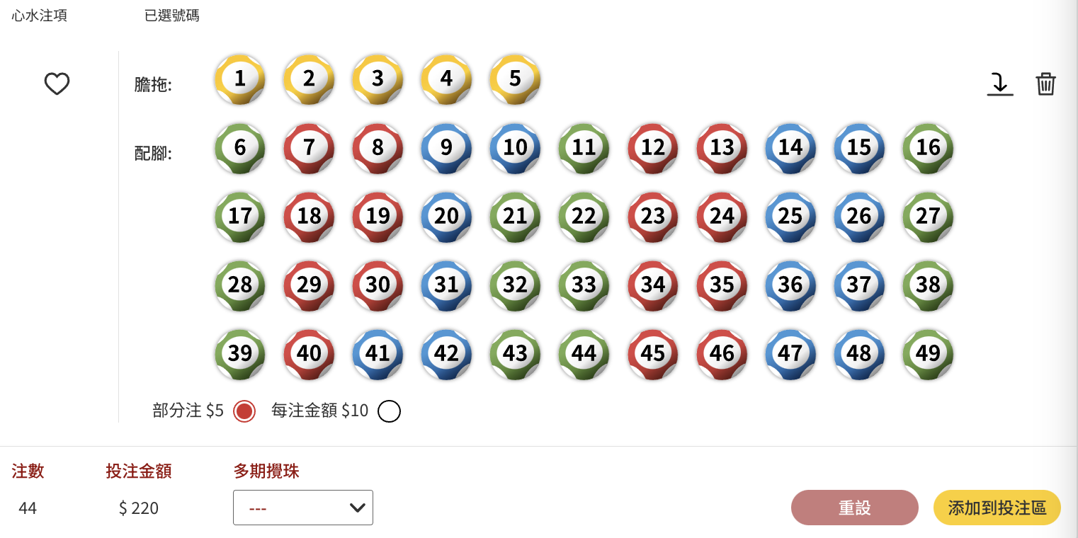 • 膽碼:1、2、3、4、5(你最有信心嘅5個號)