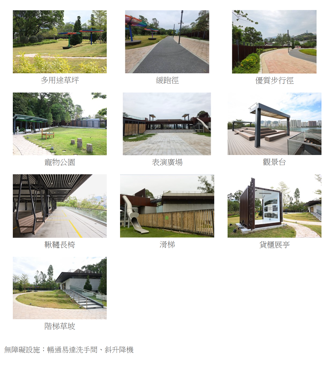 康文署在社交平台形容,葵涌公園設有觀景平台和韆鞦椅,可居高臨下觀賞藍巴勒海峽和青衣島東岸遼闊景色。公園還有約5米高的滑梯、表演場地、休憩草坪、緩跑徑等設施,寵物公園分別設有大、小狗活動區。
