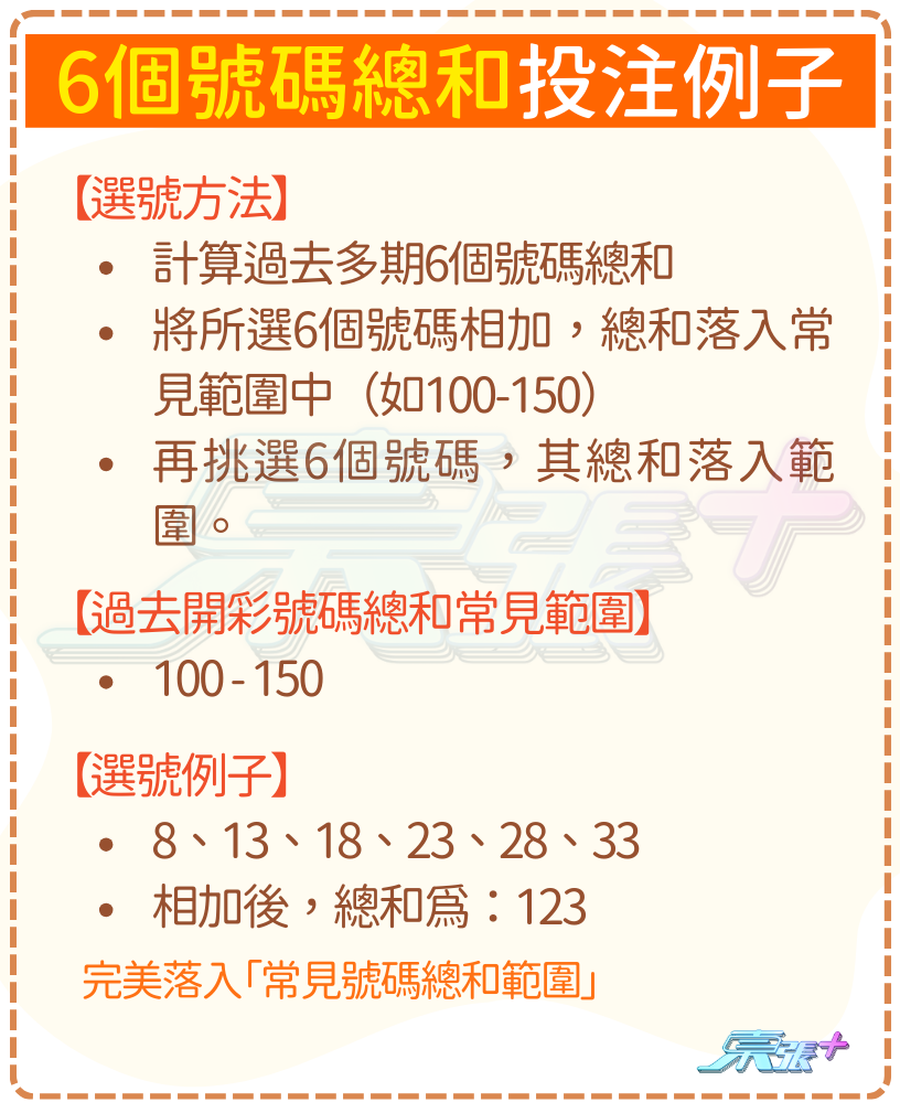 - 六個號碼總和法是計算選號總和值,確保落在歷史常見範圍內的策略。