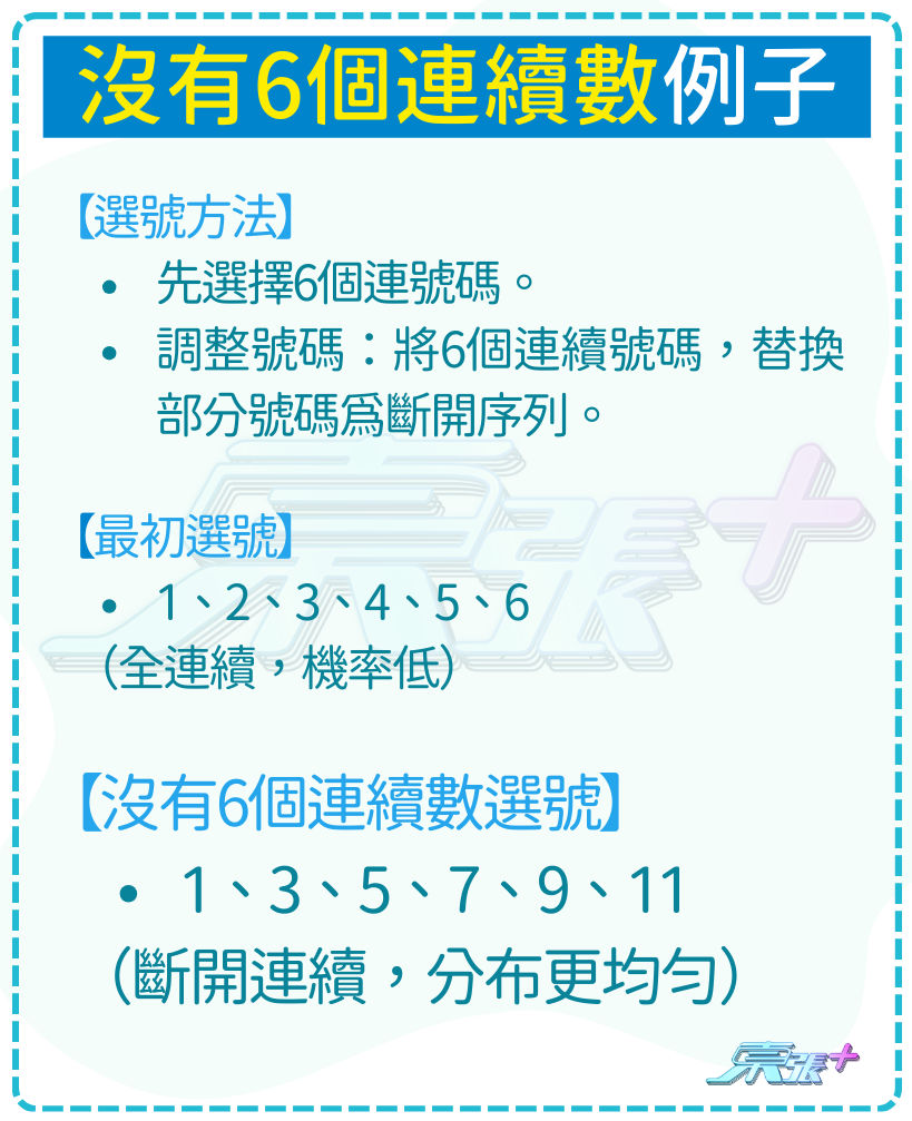 - 沒有6個連續數策略強調避免選擇六個連續數字的組合,因為這種排列在六合彩歷史中出現概率極低。