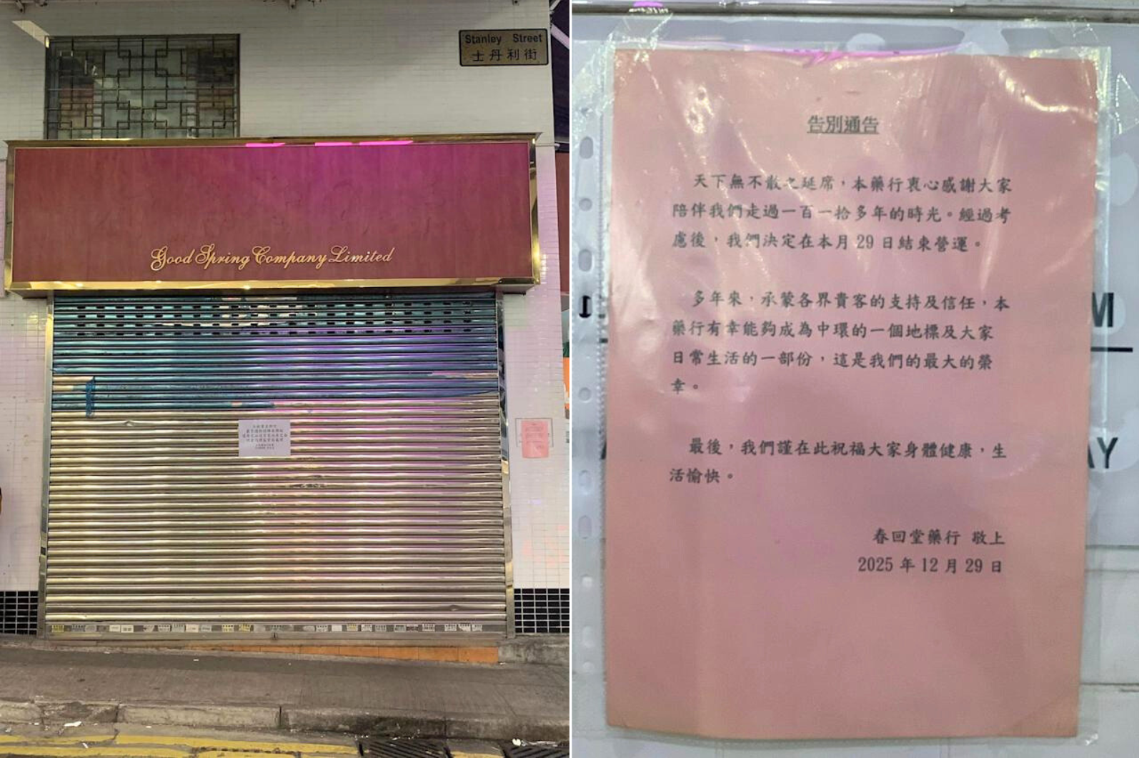 中環閣麟街8號的春回堂藥行,於2025年12月29日突然宣布結業,大門落閘,金漆招牌也拆下了,結束了110年的營運。店方貼出告示:「天下無不散之筵席,本藥行衷心感謝大家陪伴我們走過110多年的時光,經過考慮後,我們決定在2025年12月29日結束營運。本藥行有幸能夠成為中環的一個地標及大家日常生活的一部分,謹此衷心感謝各位多年來的支持及惠顧。」