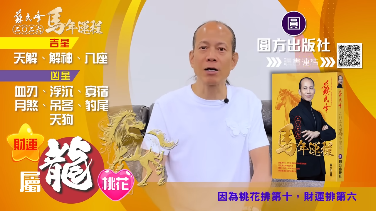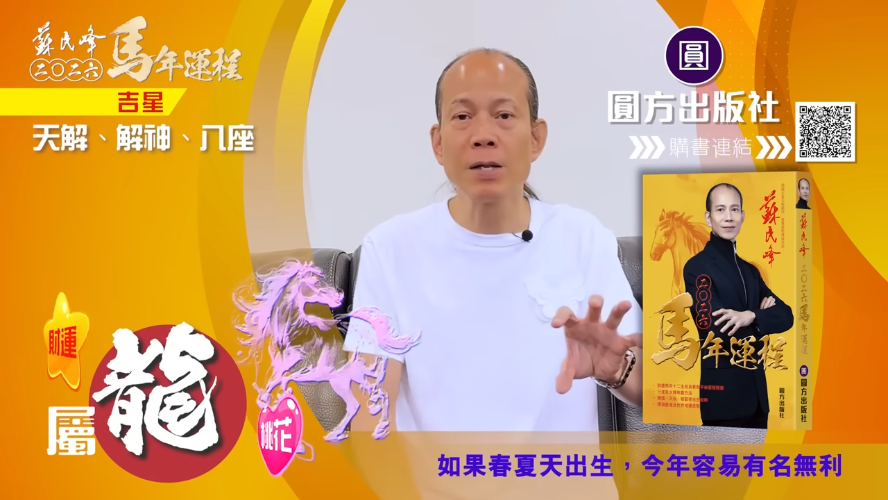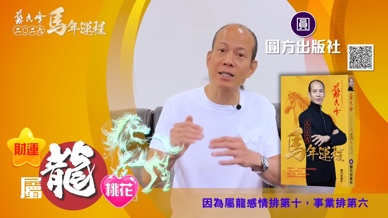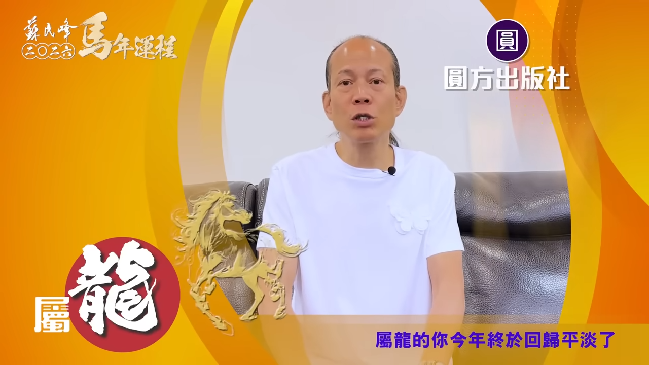 【蘇民峰/蘇民峰師傅/蘇民峰2026運程/馬年生肖運程預測/丙午年運程】踏入年尾,著名玄學大師蘇民峰師傅推出全新《2026馬年十二生肖運程》,並於YouTube頻道「娛樂星玄」詳盡分析各生肖運勢。丙午馬年與生肖龍既非相沖,亦非相合,整體屬於「不高不低」的平穩年份,事業發展雖有升職機會,但變化不算劇烈;財運及桃花同樣中規中矩,只要步伐穩妥、懂得分清輕重,自然可以安然渡過一年。