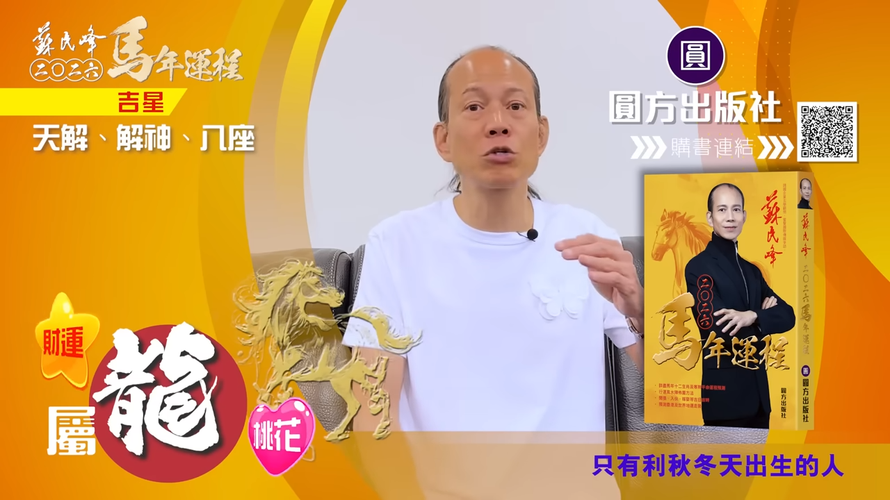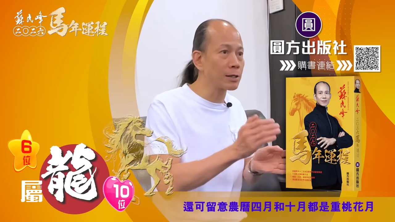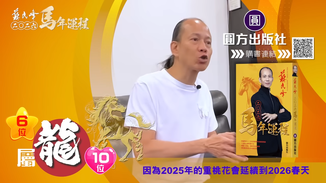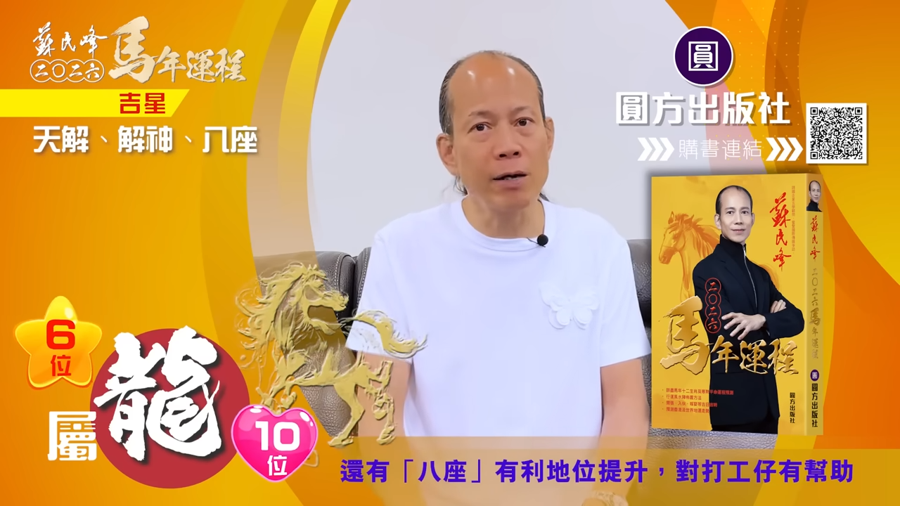 【蘇民峰/蘇民峰師傅/蘇民峰2026運程/馬年生肖運程預測/丙午年運程】踏入年尾,著名玄學大師蘇民峰師傅推出全新《2026馬年十二生肖運程》,並於YouTube頻道「娛樂星玄」詳盡分析各生肖運勢。丙午馬年與生肖龍既非相沖,亦非相合,整體屬於「不高不低」的平穩年份,事業發展雖有升職機會,但變化不算劇烈;財運及桃花同樣中規中矩,只要步伐穩妥、懂得分清輕重,自然可以安然渡過一年。