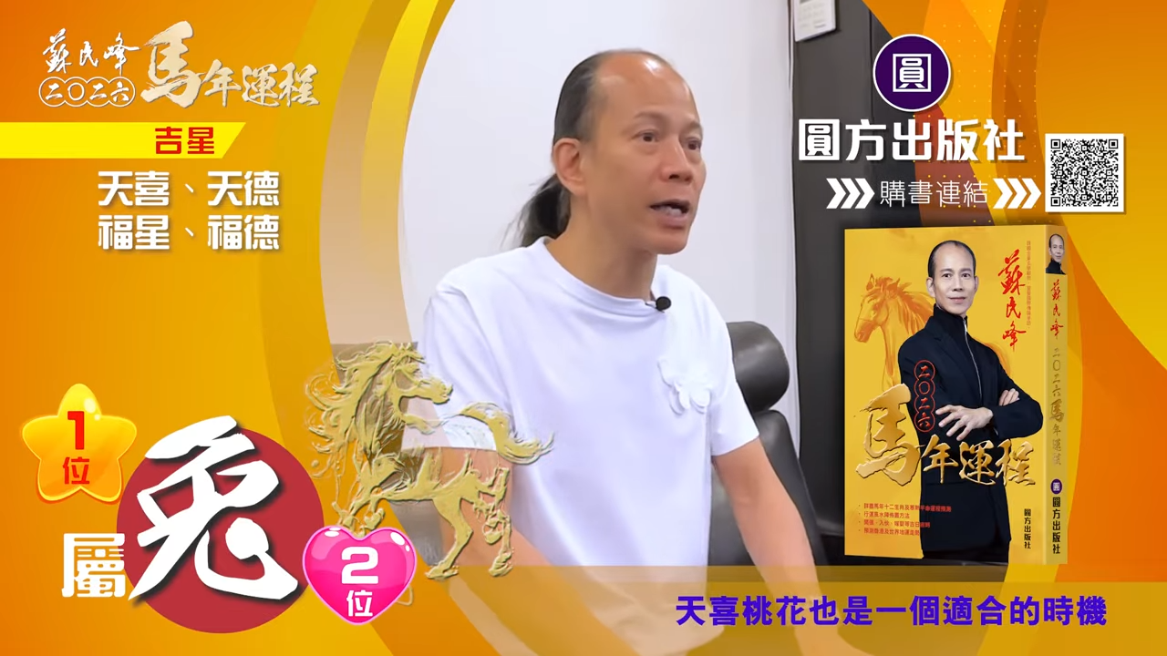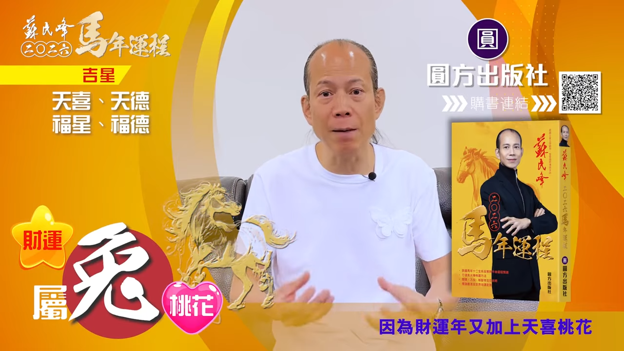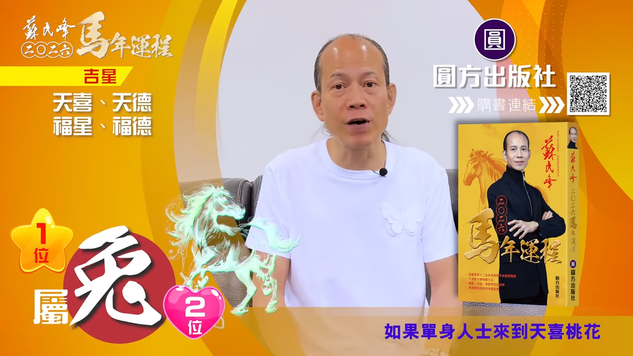 【蘇民峰/蘇民峰師傅/蘇民峰2026運程/馬年生肖運程預測/丙午年運程】踏入年尾,著名玄學大師蘇民峰師傅推出全新《2026馬年十二生肖運程》,並於YouTube頻道「娛樂星玄」詳盡分析各生肖運勢。屬兔人士今年財運排名第一,桃花運排名第二,簡直正呀!因財運年加桃花年,加持,整體運勢睇高一線。即使面對挑戰也能頂住,上班族工作順利,生意人易傾生意。單身者易遇可發展對象,適合結婚或懷孕,尤其5月及11月桃花最旺。需留意長輩健康,避免意外。