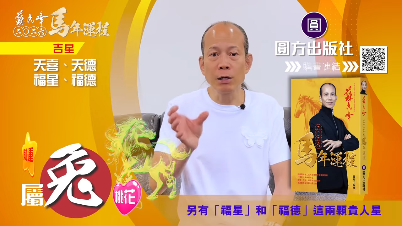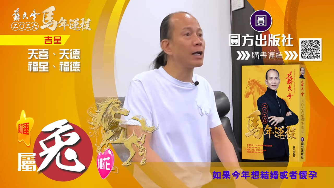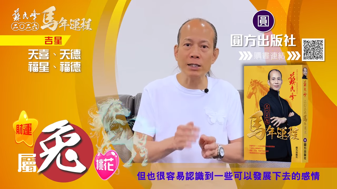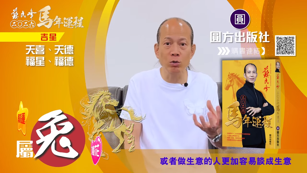 【蘇民峰/蘇民峰師傅/蘇民峰2026運程/馬年生肖運程預測/丙午年運程】踏入年尾,著名玄學大師蘇民峰師傅推出全新《2026馬年十二生肖運程》,並於YouTube頻道「娛樂星玄」詳盡分析各生肖運勢。屬兔人士今年財運排名第一,桃花運排名第二,簡直正呀!因財運年加桃花年,加持,整體運勢睇高一線。即使面對挑戰也能頂住,上班族工作順利,生意人易傾生意。單身者易遇可發展對象,適合結婚或懷孕,尤其5月及11月桃花最旺。需留意長輩健康,避免意外。