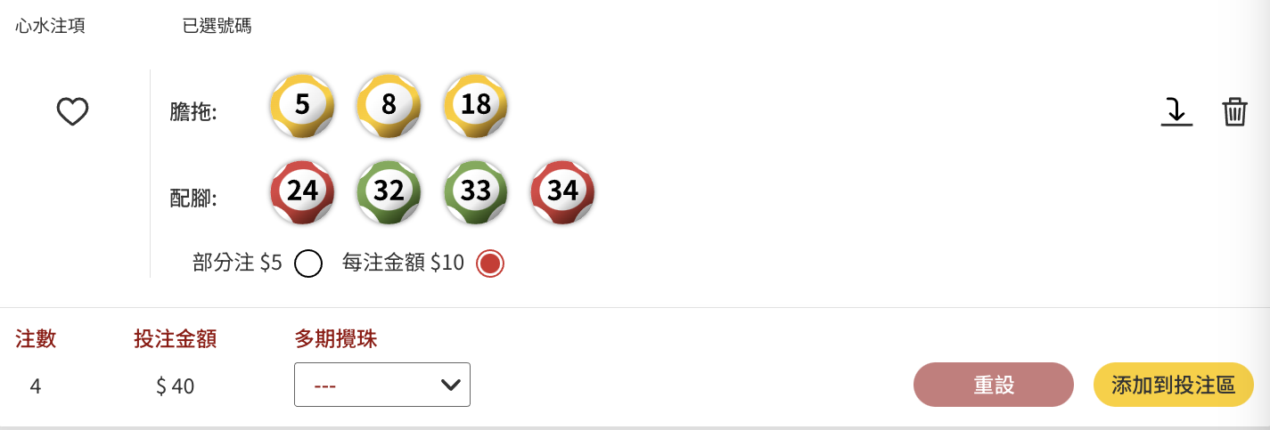 - 投注成本:每注單位$10,可選半注$5,獎金按比例計算。