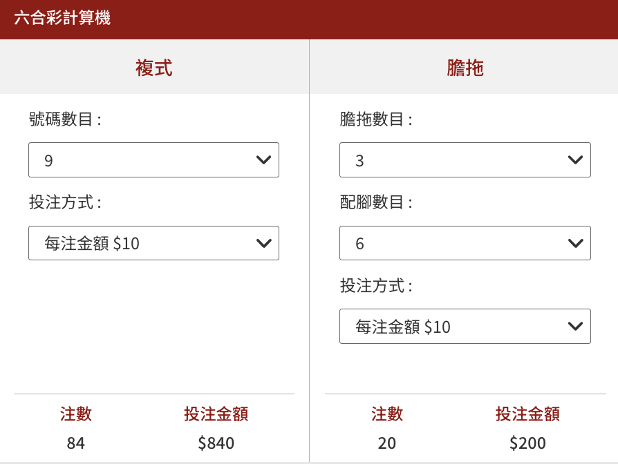 | 成本 | 最低($10/注),單一組合 | 中等(固定膽減注數,如3膽拖6 = 20注 $200) | 最高(全組合,如9碼84注$840) |