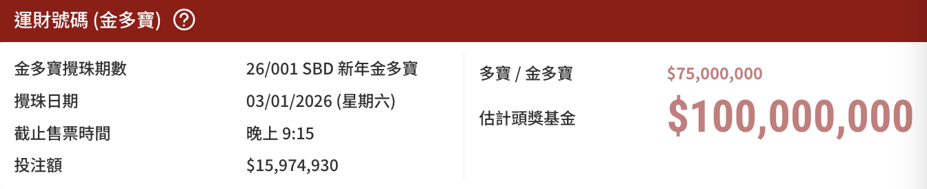 🤑 頭獎金額:1億(一注獨中,以每注10港元計)