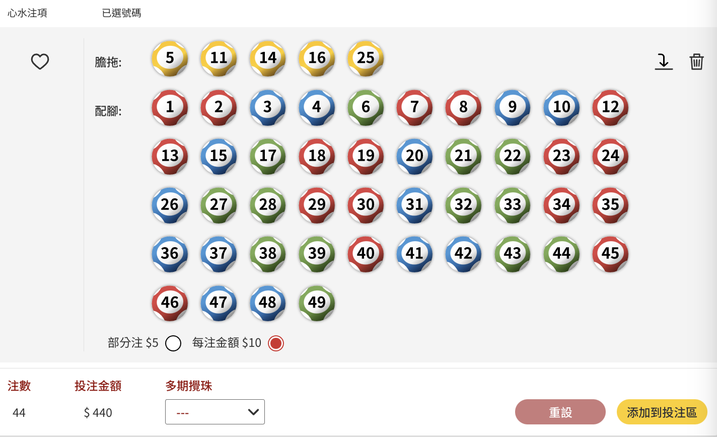- 選號方式:從1至49個號碼中選1-5個作為膽碼(每注組合必含膽碼),再選拖碼湊成6碼組合。組合數 = C(拖碼數, 6 - 膽碼數)。