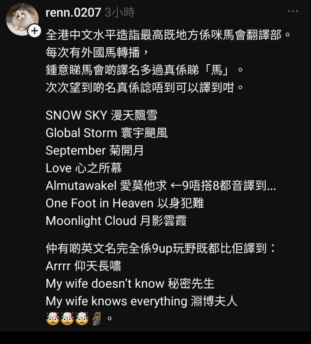 最令人佩服的是,馬會翻譯部連一些「九唔搭八」的奇怪英文馬名,都能化腐朽為神奇!帖文特別點名幾個例子: