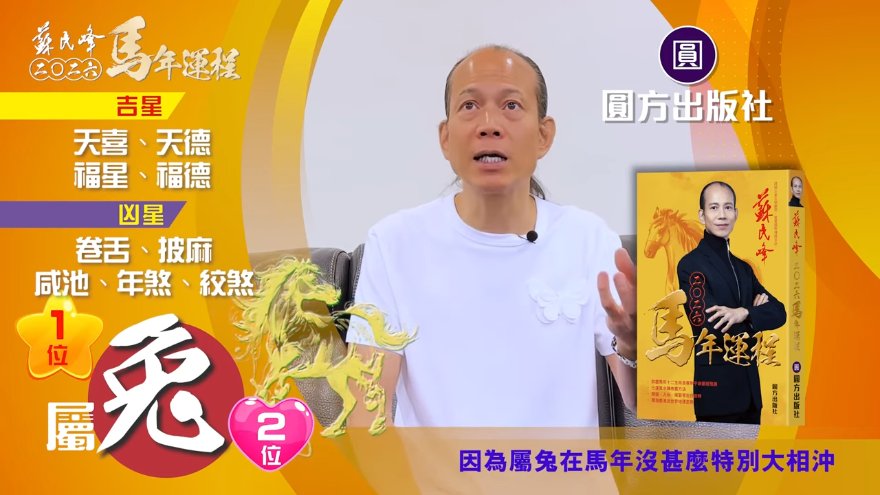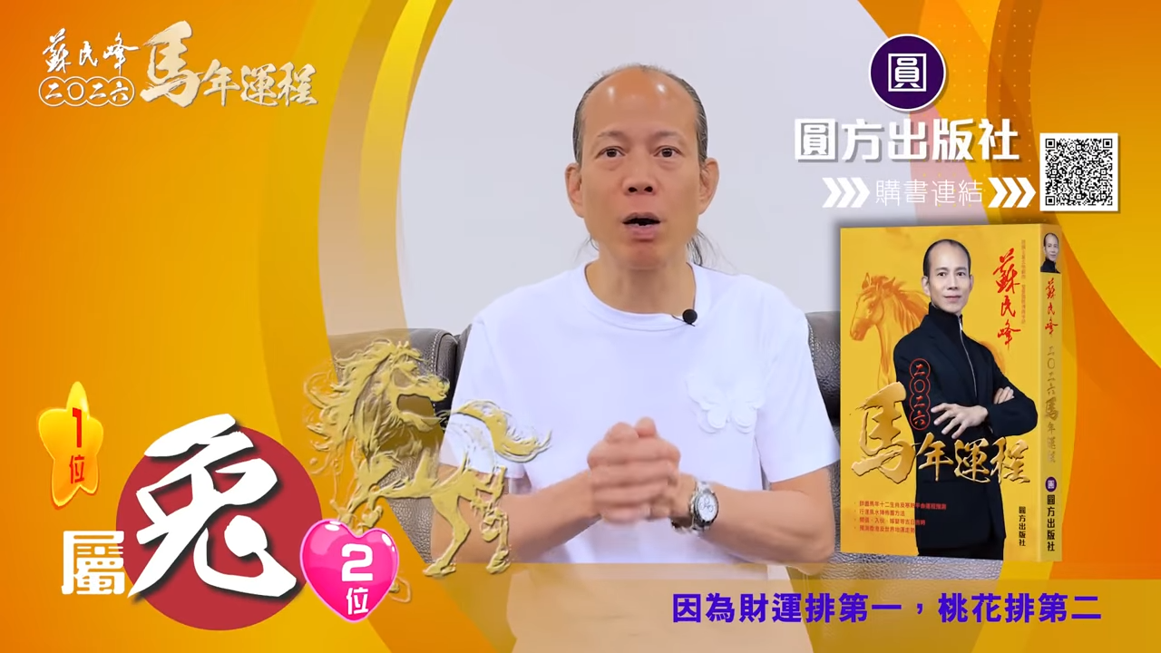 【蘇民峰/蘇民峰師傅/蘇民峰2026運程/馬年生肖運程預測/丙午年運程】明日就係大年初一,大家最關心的當然是丙午馬年運程,著名玄學大師蘇民峰師傅推出全新《2026馬年十二生肖運程》,並於YouTube頻道「娛樂星玄」詳盡分析各生肖運勢。屬兔人士財運桃花旺,屬龍人士運氣平穩,屬蛇人士轉運事業佳。
