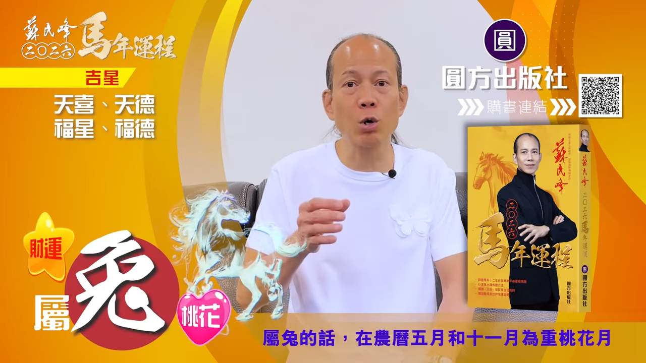整體運程:屬兔朋友在2026馬年喜迎吉星,財運排名第一,桃花亦緊隨其後。蘇民峰師傅指出,兔年人士有結婚添丁的好時機,感情生活明朗。唯一要注意的是健康,尤其是長輩的身體狀況,需多加留意。