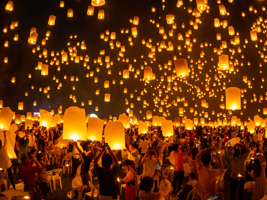 人們將新年願望寫在紙糊的天燈上,然後點燃天燈升起,期盼新年收獲成功和幸福。