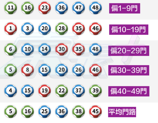 - 偏門路(缺一門):偏1-9門、偏10-19門、偏20-29門、偏30-39門、偏40-49門各一注﹐門路平均一注 ⭢ 共 6 注(49個號碼分成上述5門,所揀的號碼號碼組合將不包括其中「一門」(缺一門),原因是有數學統計80%左右六合彩攪出號碼都有「缺一門」情況。)