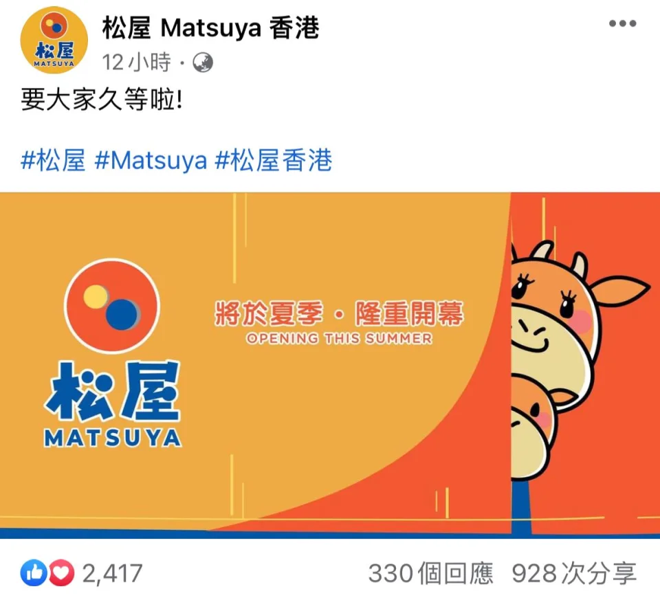 松屋香港社交媒體專頁「松屋Matsuya香港」正式宣布,將在今夏盛大開幕,並對香港的粉絲們表示「要大家久等!」。據指,今次香港店更會由日本總公司直接營運,確保牛肉飯品質保持日本當地水準,消息一出,讓一眾粉絲大感興奮。