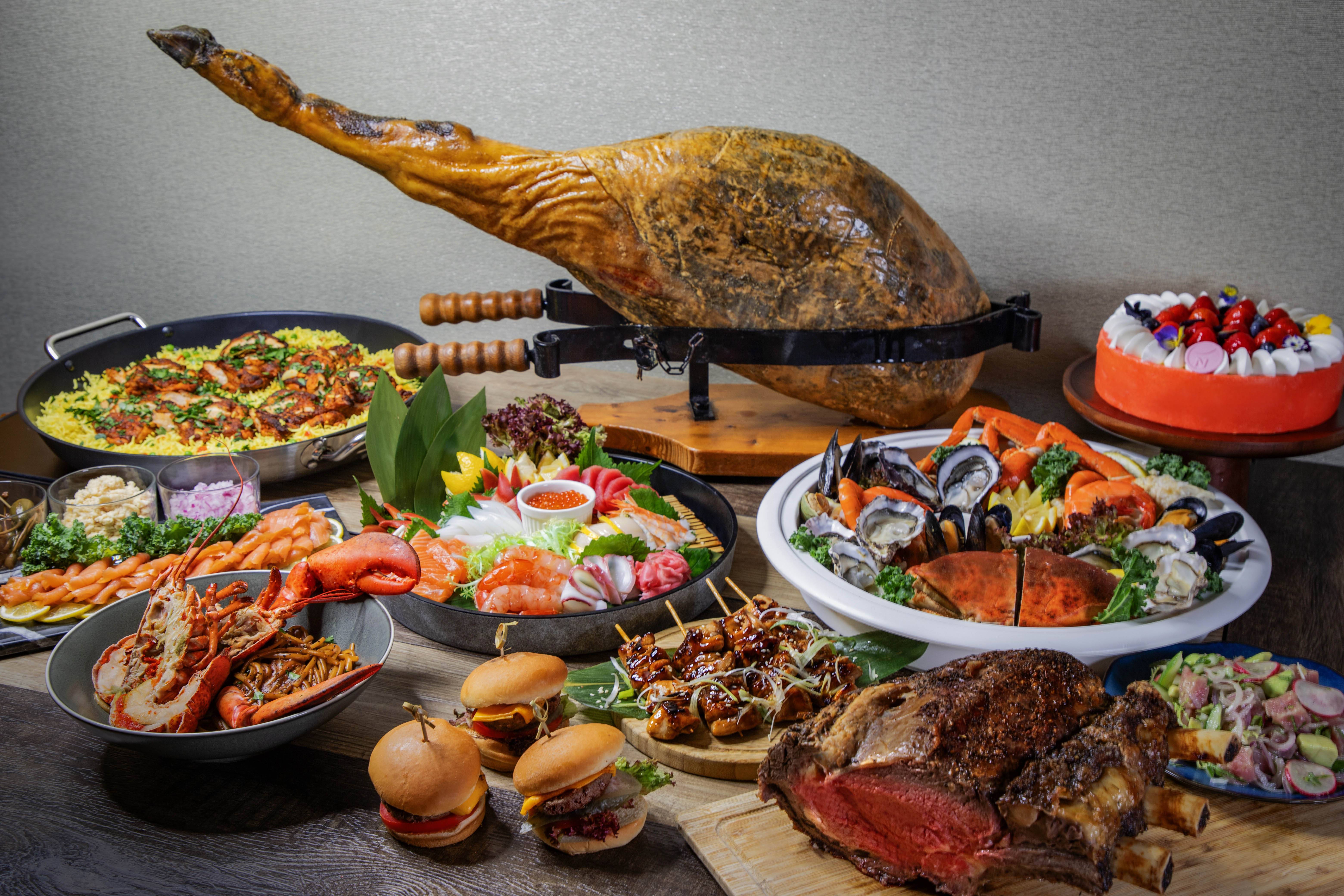 海鮮自助晚餐提供無限量生蠔(2 款)、松葉蟹腳、麵包蟹及刺身,加入不少新菜式如肉質飽滿的麵包蟹、巴馬火腿、西班牙風味乳豬配蜜糖醬、地中海雞飯、特濃龍蝦意粉、川式水煮魚、鑊炒胡椒蟹、香港風味豉汁蒸魚、安格斯小漢堡、烤牛肉及一系列全新自家製甜品,並設有紅酒任飲。(食秒款式輪流供應)