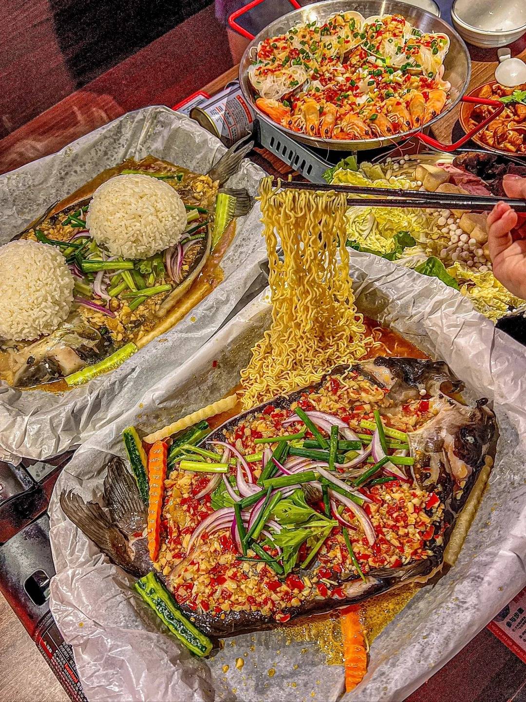 5/ 十六爺紙包魚:以其招牌香辣紙包魚聞名。魚醬料味道鮮美,不辣且可以自行調整辣度,新鮮的魚蝦魷魚和粉絲的搭配讓人贊不絕口。此外,萵筍、新鮮牛肉、腐竹和芋頭等配菜也是這裡的亮點,讓人吃了還想再吃。