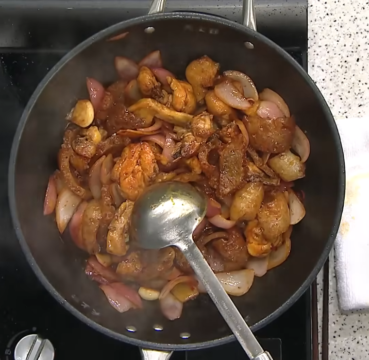 ◦ 利用鍋中由雞件釋出的油,放入薑、蒜等爆香。