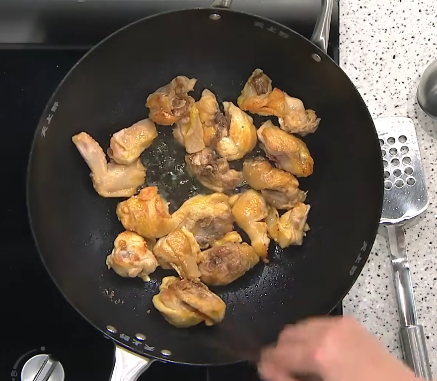 ◦ 將雞件煎至大約八成熟後盛起備用。這個階段不需要完全煮熟。(煎香)
