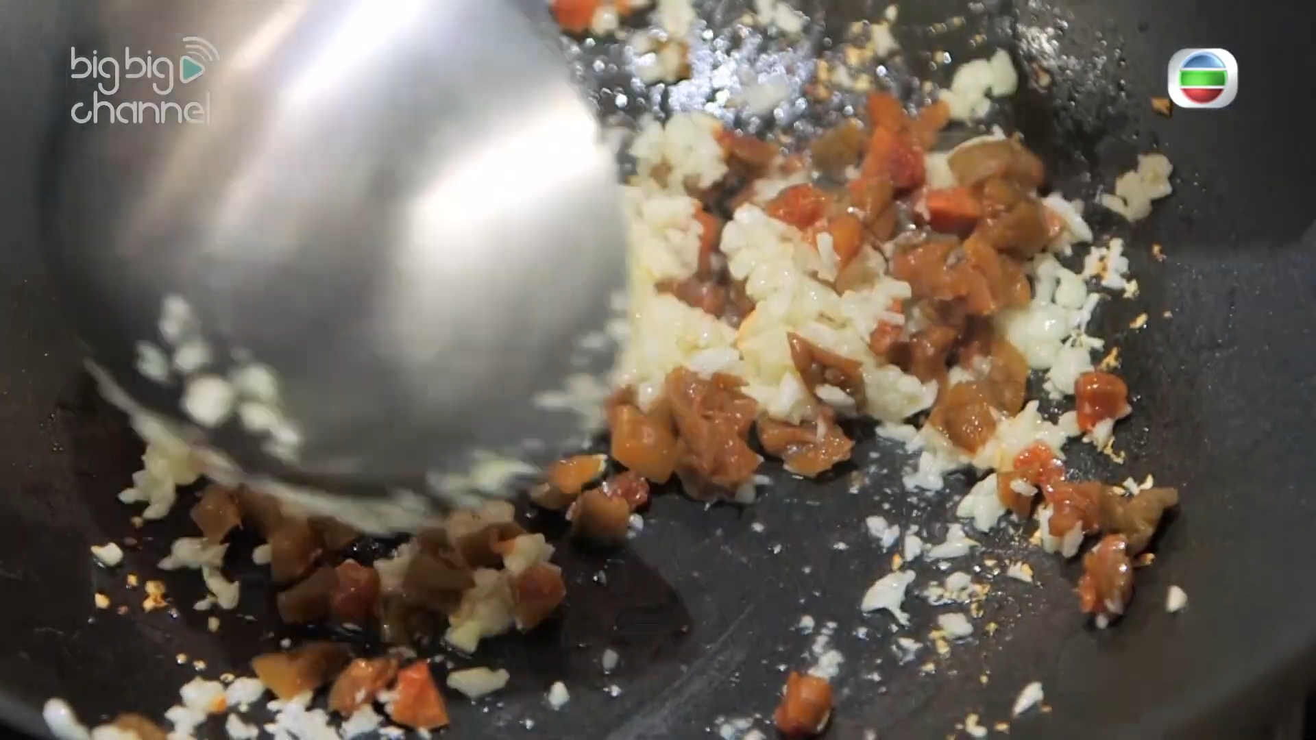 Step03: 燒熱鑊加油,轉中火加入蒜蓉煮至有香味,再加入梅子肉。