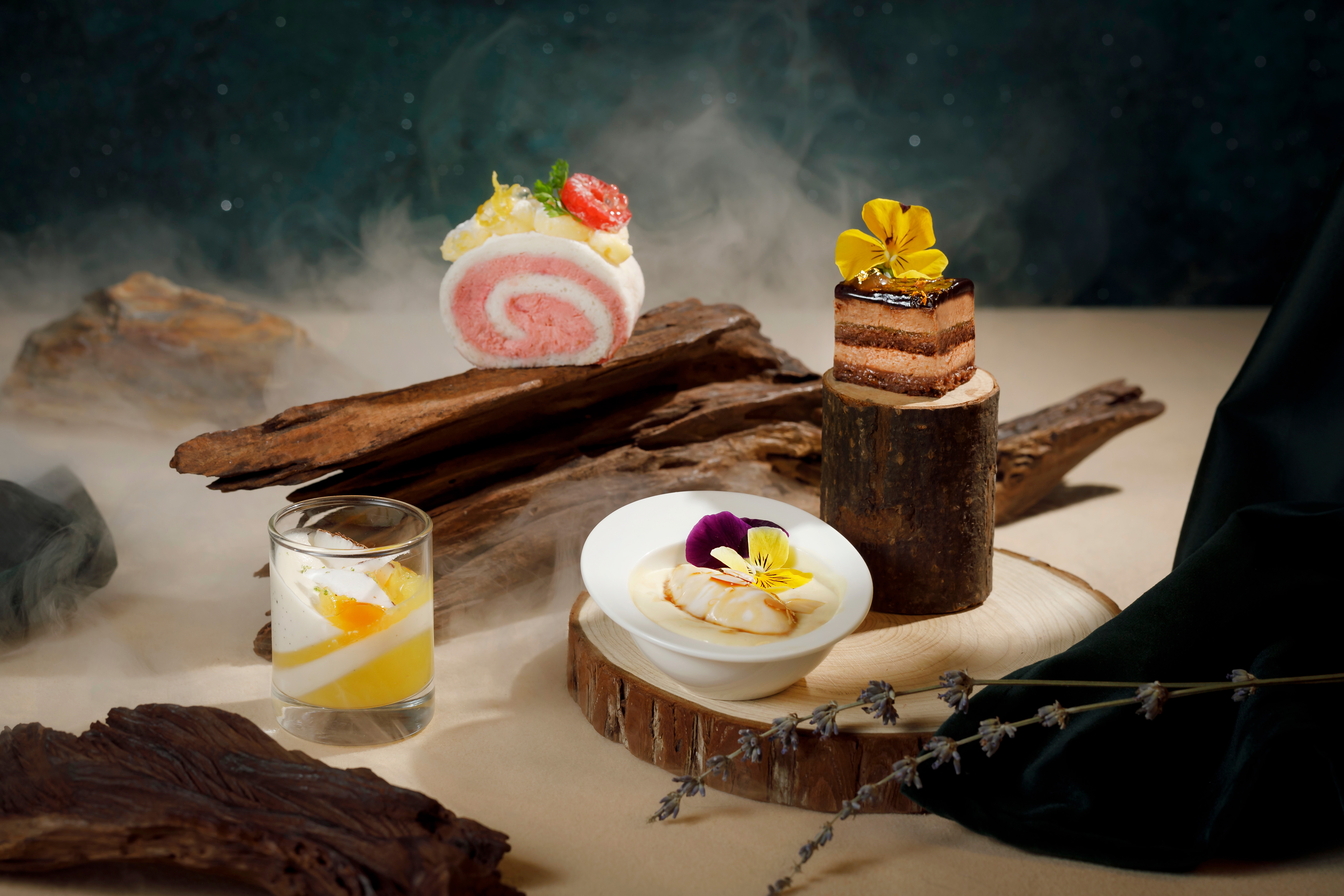 甜點 - 漂浮之島配薰衣草雲呢拿醬、天使蛋糕卷配佛手柑奶酪、椰林飄香意式奶凍配菠蘿啫喱及椰絲、 橙花香橘朱古力蛋糕🍰、新鮮焗製英式綠茶鬆餅配自家製柚子橙醬及凝脂忌廉