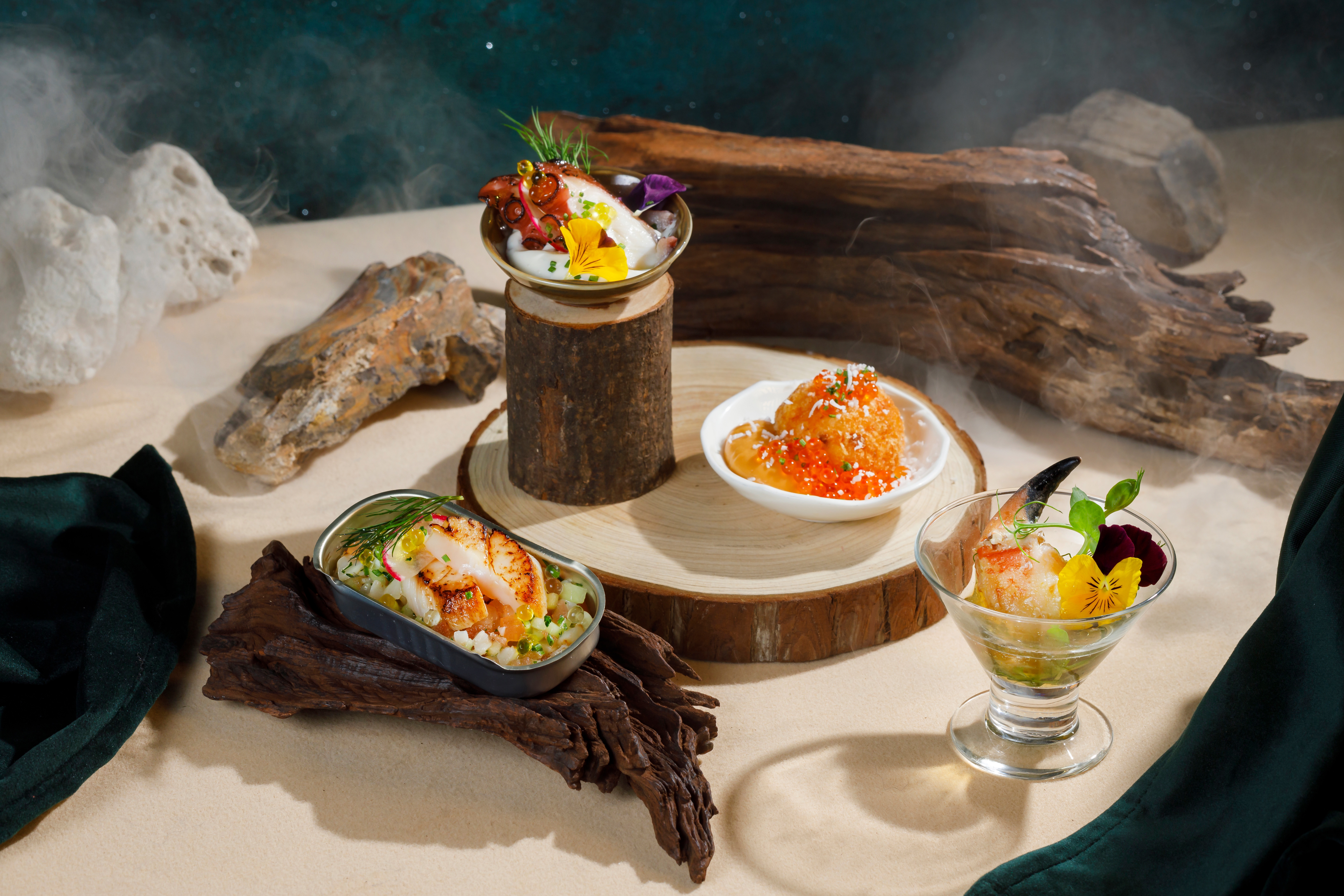 鹹點 - 北海麵包蟹鉗配洋甘菊雞尾酒醬🦀、帶子青瓜他他配佛手柑汁、慢煮蜜汁八爪魚、🦞龍蝦煙三文魚可樂餅配椰子碎